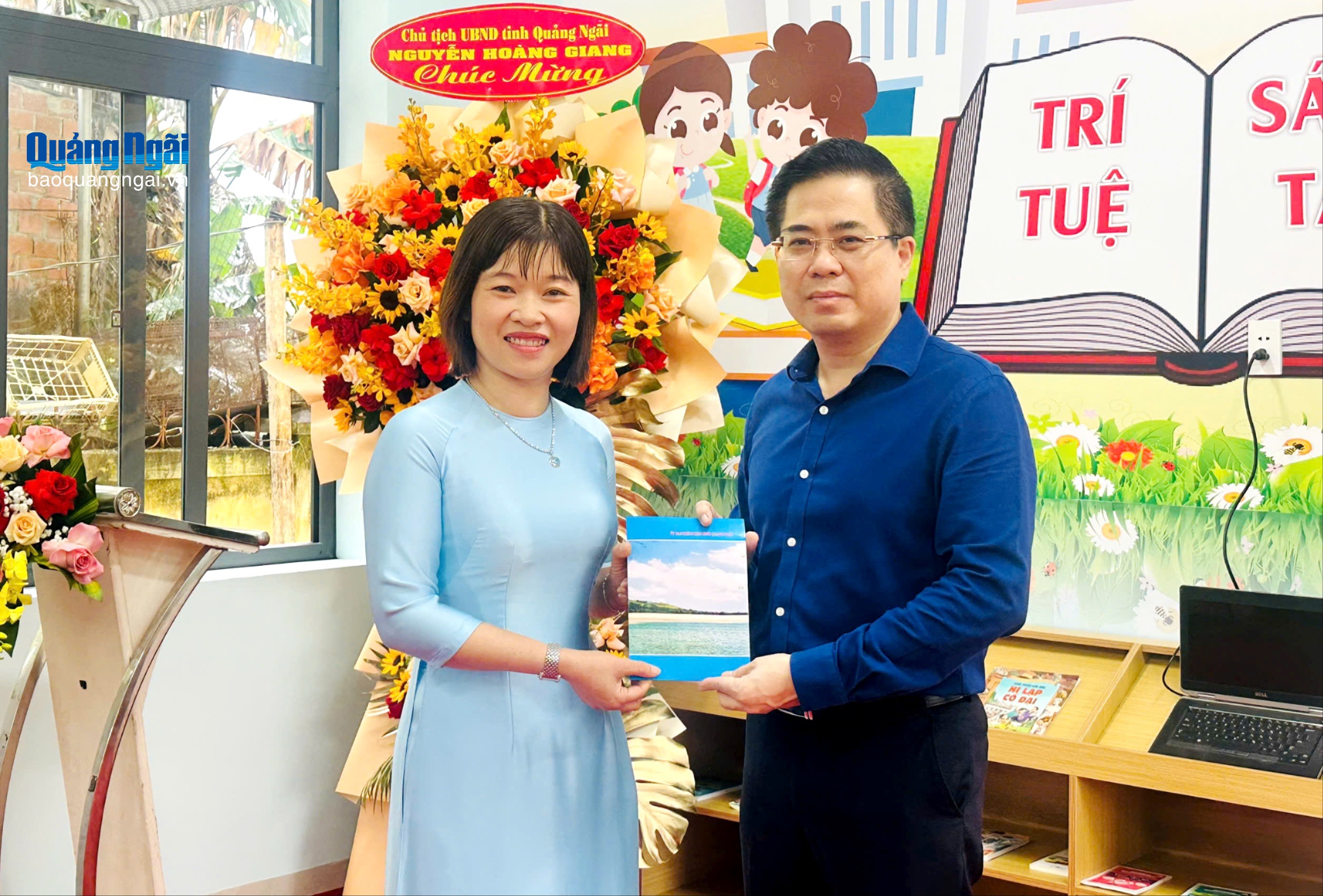 Đồng chí Nguyễn Hoàng Giang đã tặng hoa, chúc mừng thầy trò Trường THCS Hành Minh kể từ hôm nay đã có công trình thư viện khang trang, phục vụ công tác dạy và học. Đồng chí ghi nhận sự hỗ trợ kinh phí, kịp thời xây dựng công trình thư viện ý nghĩa của đơn vị tài trợ.