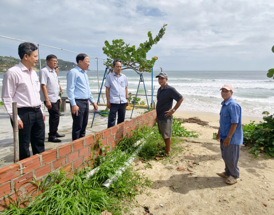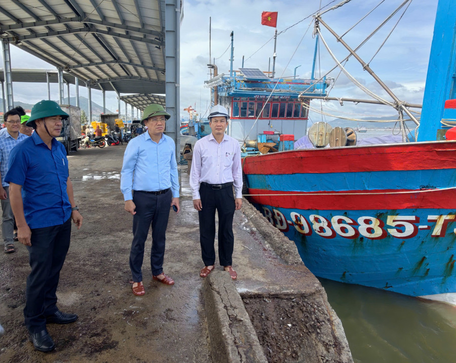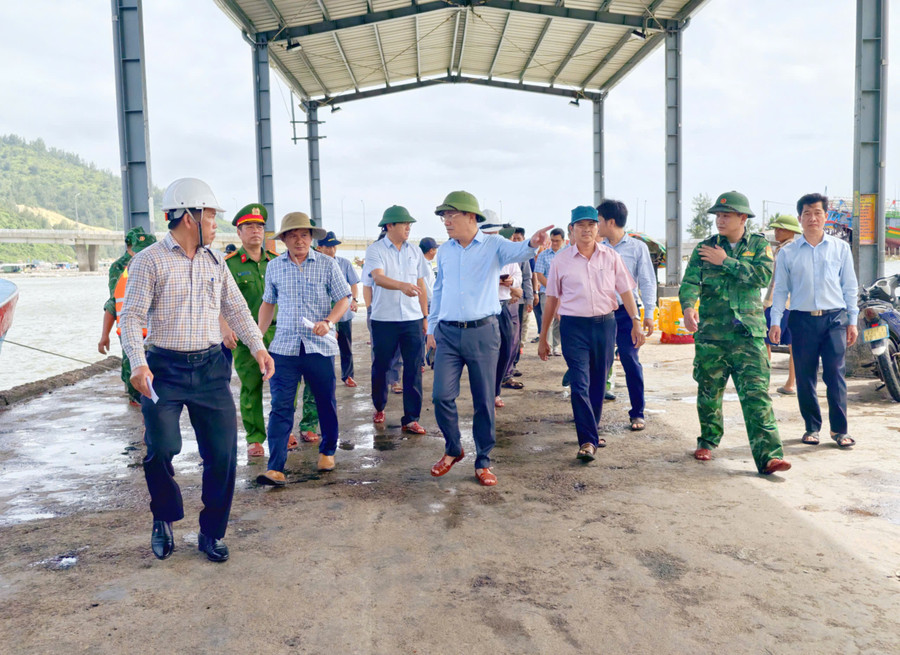 Chủ tịch UBND tỉnh Phạm Anh Tuấn (giữa) kiểm tra công tác ứng phó với bão số 13 tại Cảng cá Đề Gi. Ảnh: Dũng Nhân