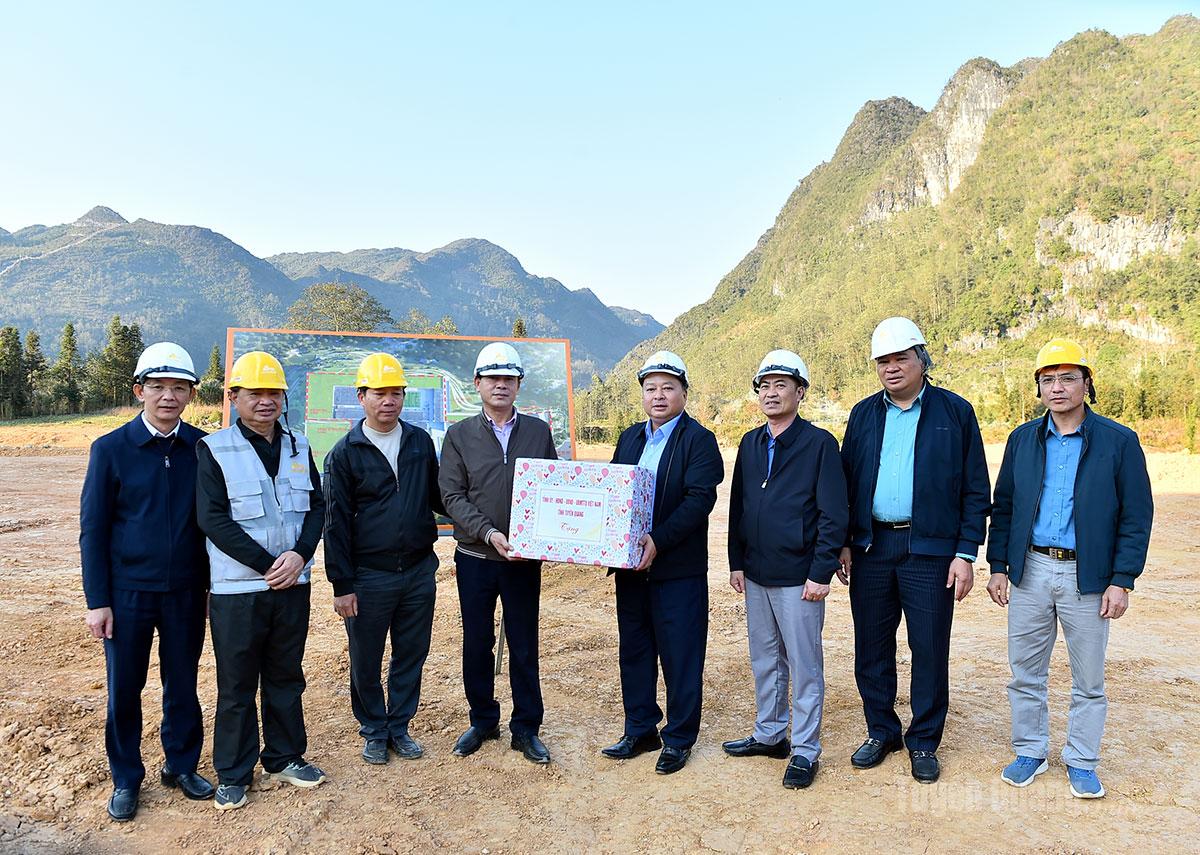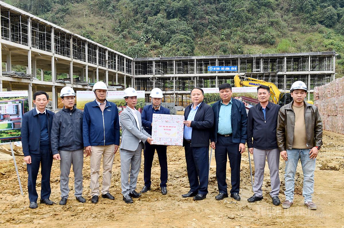 Đồng chí Chủ tịch UBND tỉnh Phan Huy Ngọc tặng quà công nhân thi công công trình trường Phổ thông nội trú liên cấp Tiểu học và Trung học cơ sở Phố Bảng.