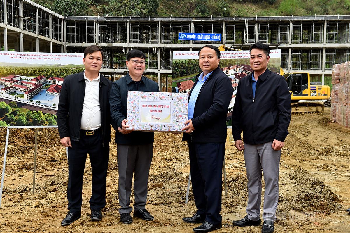 Đồng chí Chủ tịch UBND tỉnh Phan Huy Ngọc tặng quà công nhân thi công công trình xây dựng trường Phổ thông nội trú liên cấp Tiểu học và Trung học cơ sở Minh Tân.