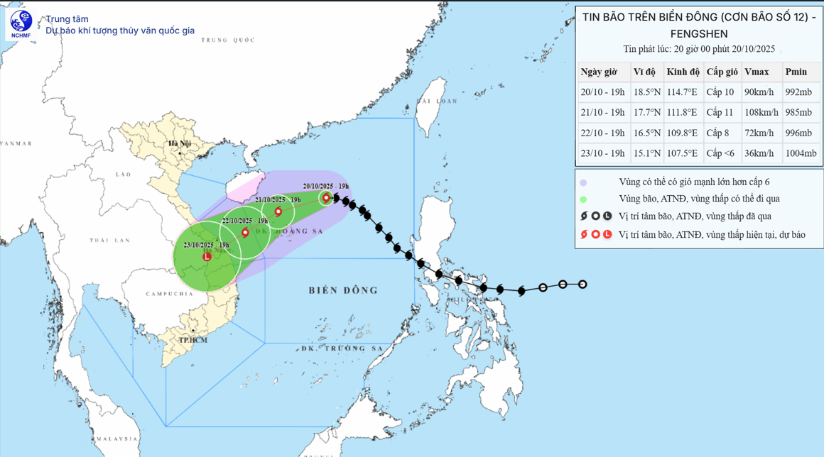 Theo Đài Khí tượng Thủy văn tỉnh Quảng Ngãi, hồi 7 giờ ngày 20/10, tâm bão số 12 (bão Fengshen) ở khoảng 17,8 độ vĩ Bắc, 116,9 độ kinh Đông, cách quần đảo Hoàng Sa khoảng 490km về phía Đông Đông Bắc, sức gió mạnh nhất cấp 9, giật cấp 11. Dự báo từ ngày 20-26/10, do ảnh hưởng của hoàn lưu bão kết hợp không khí lạnh, khu vực Quảng Ngãi sẽ có mưa to đến rất to. Mưa lớn đặc biệt xảy ra tại vùng ven biển Dung Quất, Lý Sơn và các huyện miền núi, tiềm ẩn nguy cơ cao về ngập lụt, lũ quét, sạt lở đất.