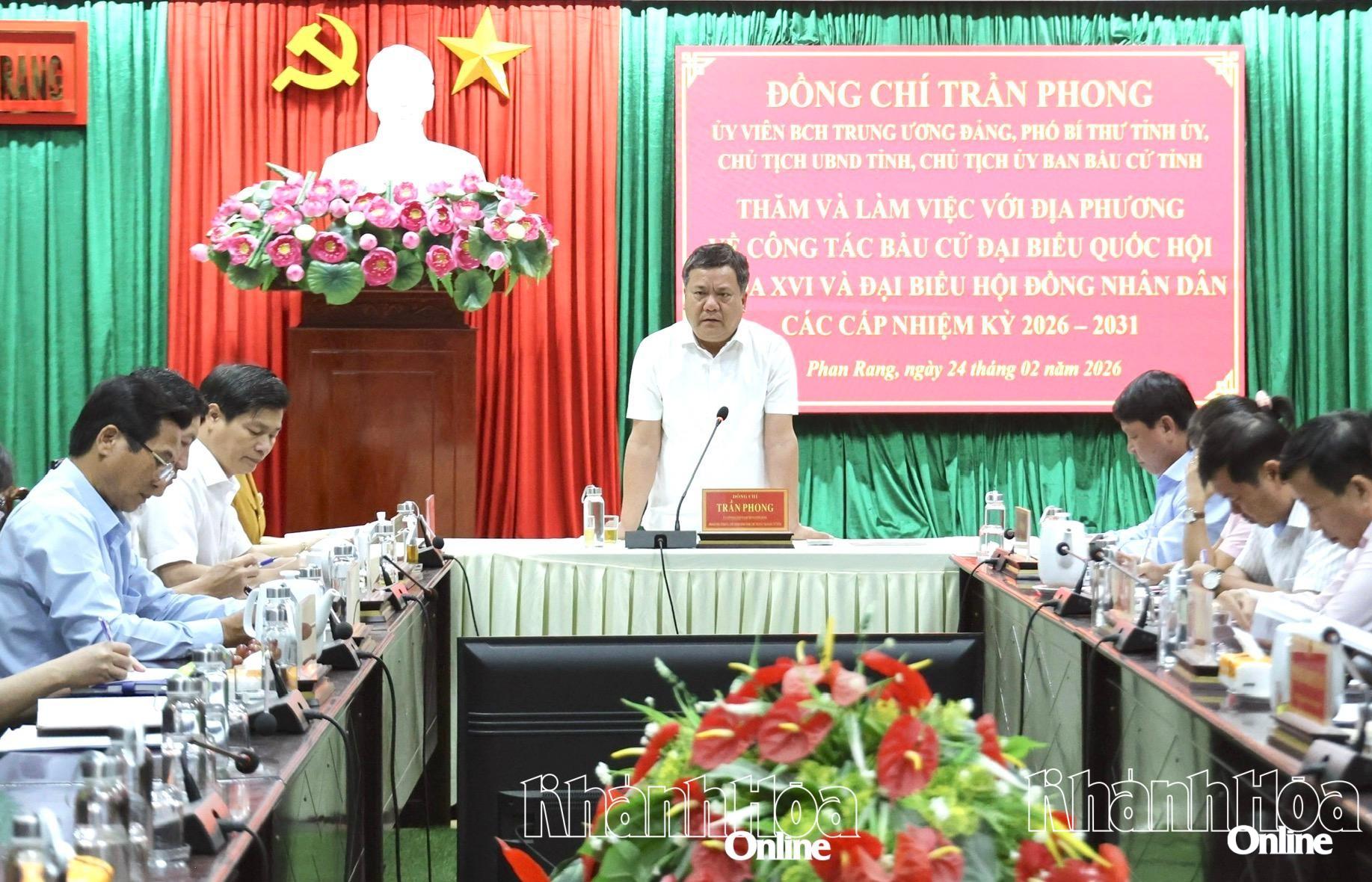 Sáng 24-2, đồng chí Trần Phong - Ủy viên Ban Chấp hành Trung ương Đảng, Phó Bí thư Tỉnh ủy, Chủ tịch UBND tỉnh cùng đoàn công tác của tỉnh kiểm tra công tác bầu cử đại biểu Quốc hội khóa XVI và đại biểu HĐND các cấp nhiệm kỳ 2026-2031 tại các xã, phường: Xuân Hải, Vĩnh Hải, Phan Rang, Phước Dinh.