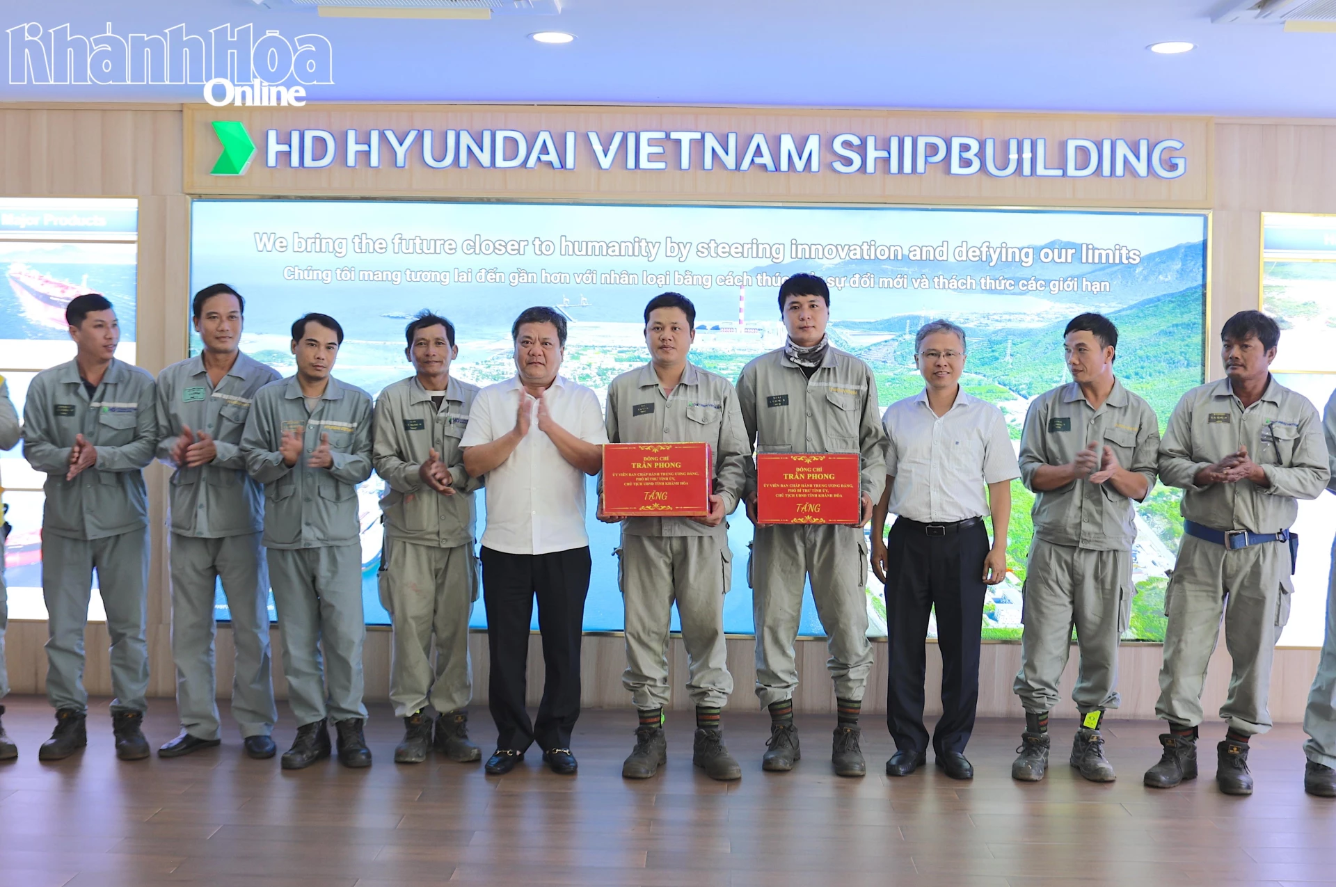 Lãnh đạo tỉnh tặng quà cho người lao động Công ty TNHH Đóng tàu HD Hyundai Việt Nam.