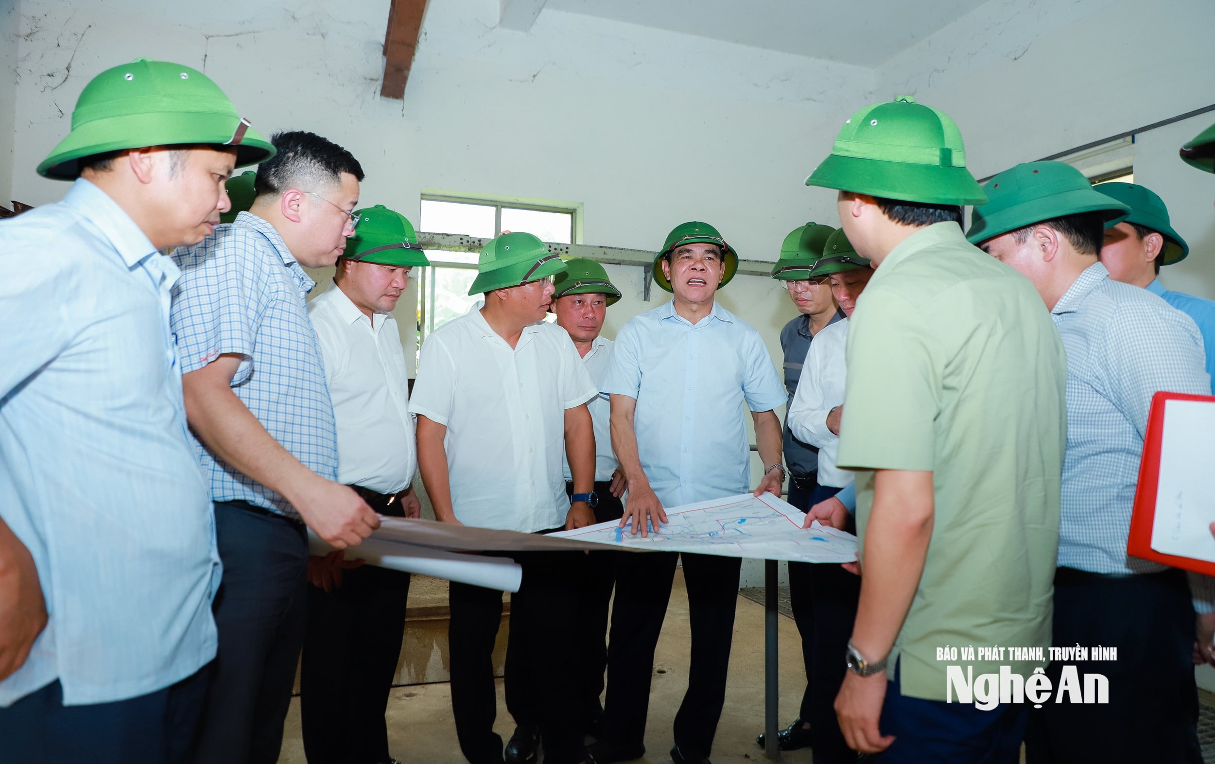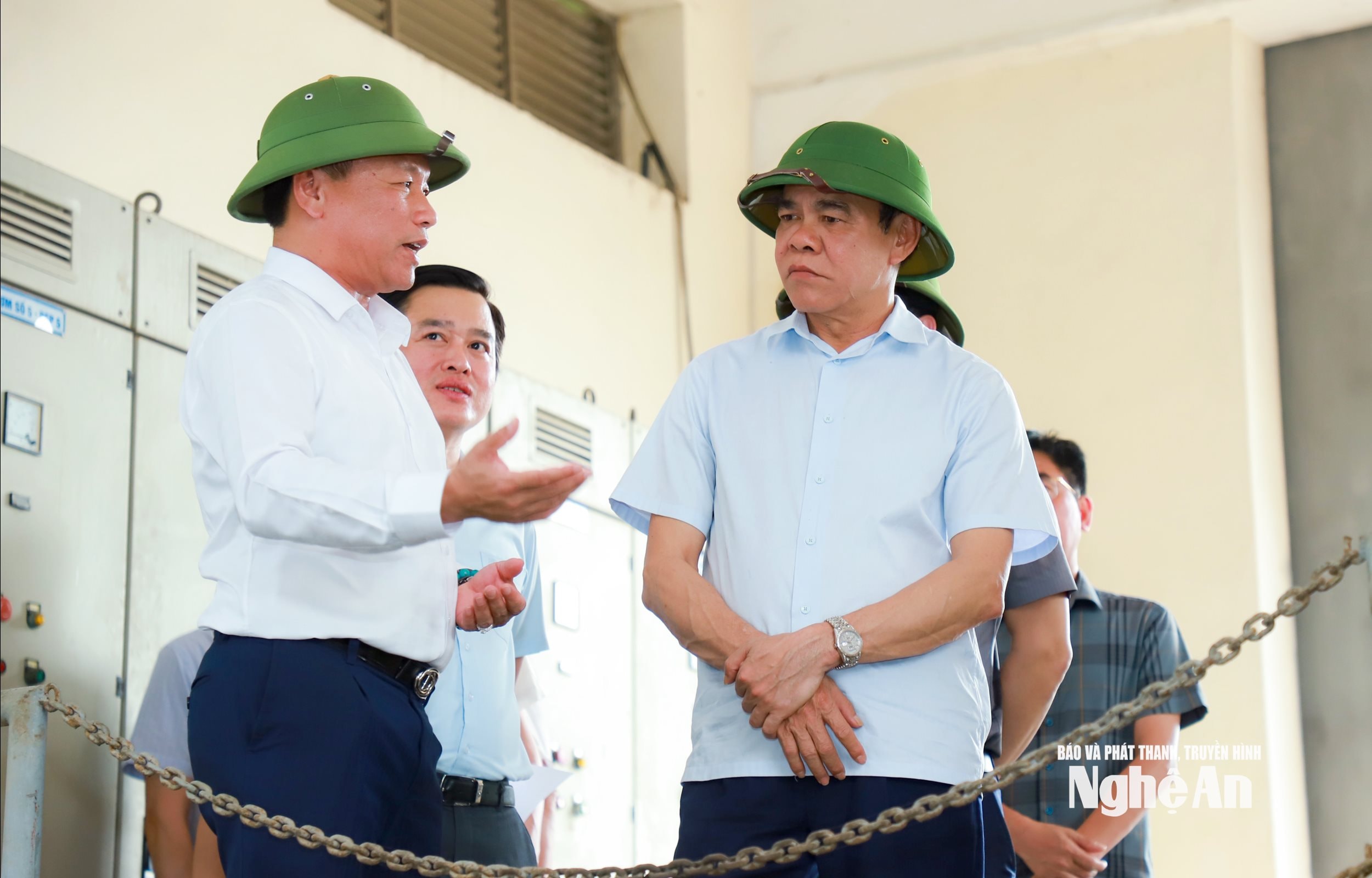 Chủ tịch UBND tỉnh Võ Trọng Hải kiểm tra tại Trạm bơm số 2, ở phường Trường Vinh. Ảnh: Thành Duy