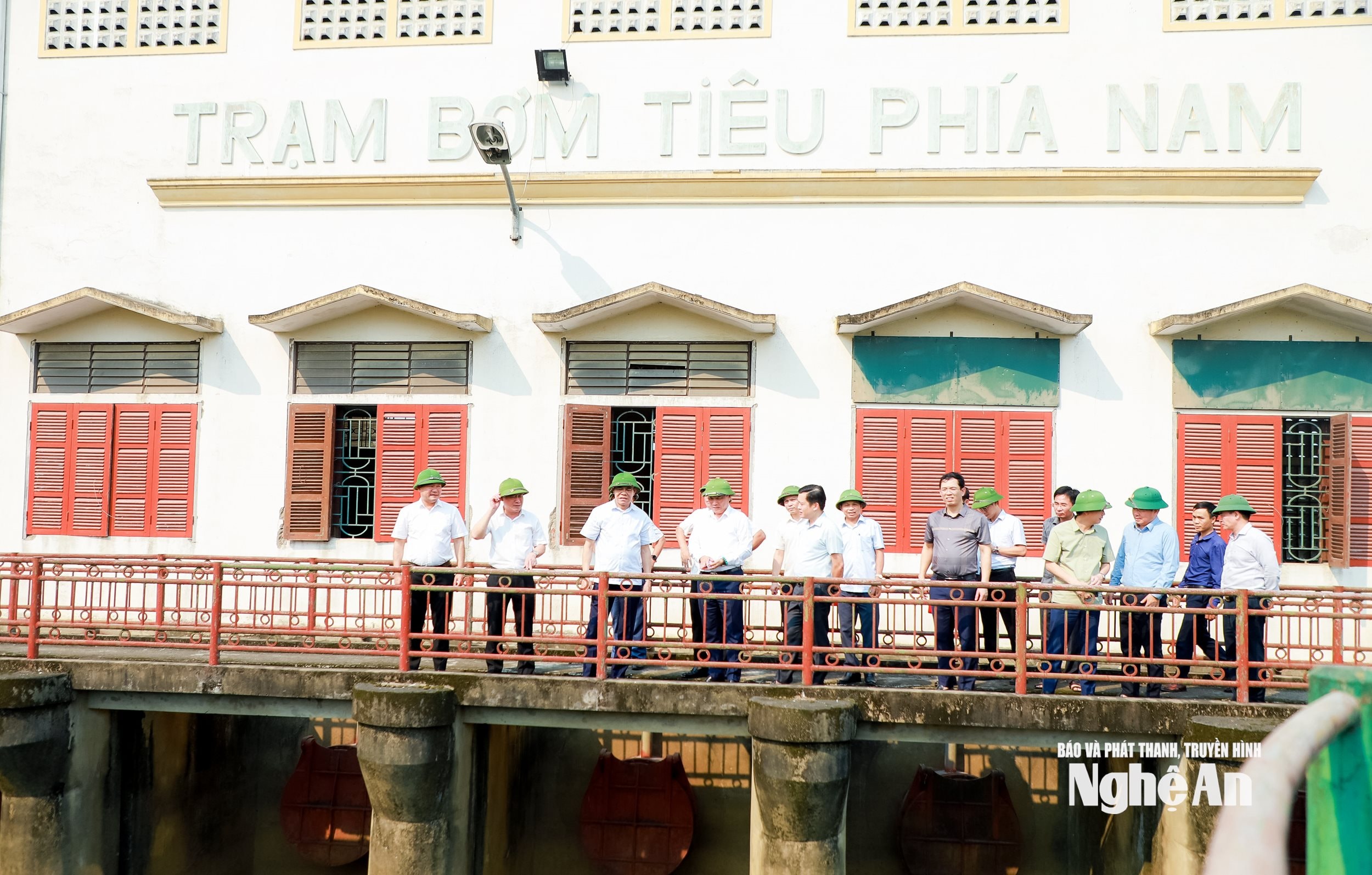 Song song với hạ tầng giao thông, đoàn công tác khảo sát hệ thống tiêu thoát nước đô thị để chủ động ứng phó mùa mưa bão. Các điểm kiểm tra gồm trạm bơm số 2, số 3, khu vực bara Bến Thủy và trạm bơm tiêu phía Nam (phường Trường Vinh).