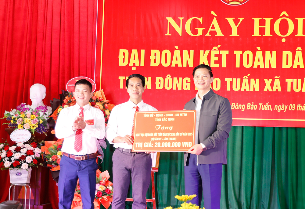 Tại đây, đồng chí Vương Quốc Tuấn thay mặt các đồng chí lãnh đạo tỉnh, trao tặng lẵng hoa của Tỉnh ủy - HĐND - UBND - Ủy ban MTTQ tỉnh; trao Bằng khen của Chủ tịch UBND tỉnh cho cán bộ và Nhân dân thôn Đông Bảo Tuấn; tặng một phần quà bằng hiện vật (bộ âm ly và loa trang bị cho nhà văn hóa thôn, bức chân dung Chủ tịch Hồ Chí Minh và Chủ tịch Tôn Đức Thắng) trị giá 20 triệu đồng cho thôn Đông Bảo Tuấn.