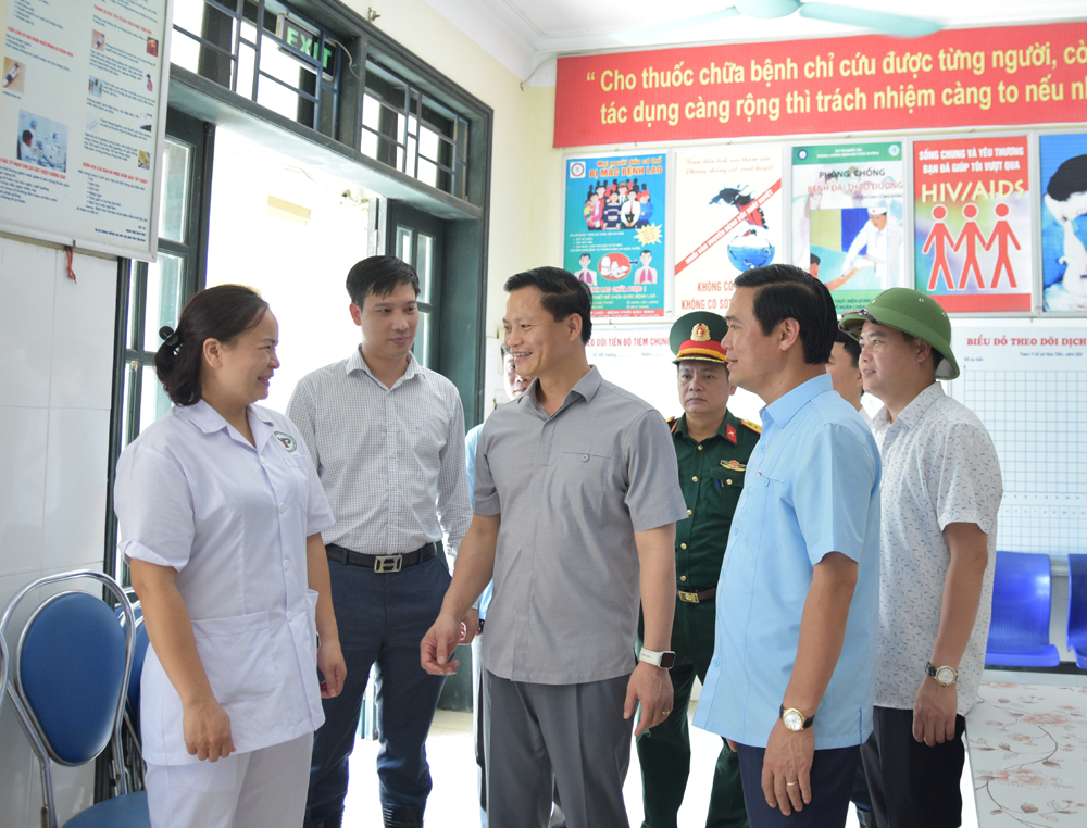 Các đồng chí lãnh đạo tỉnh động viên cán bộ Trạm Y tế Hòa Tiến (xã Tam Giang).