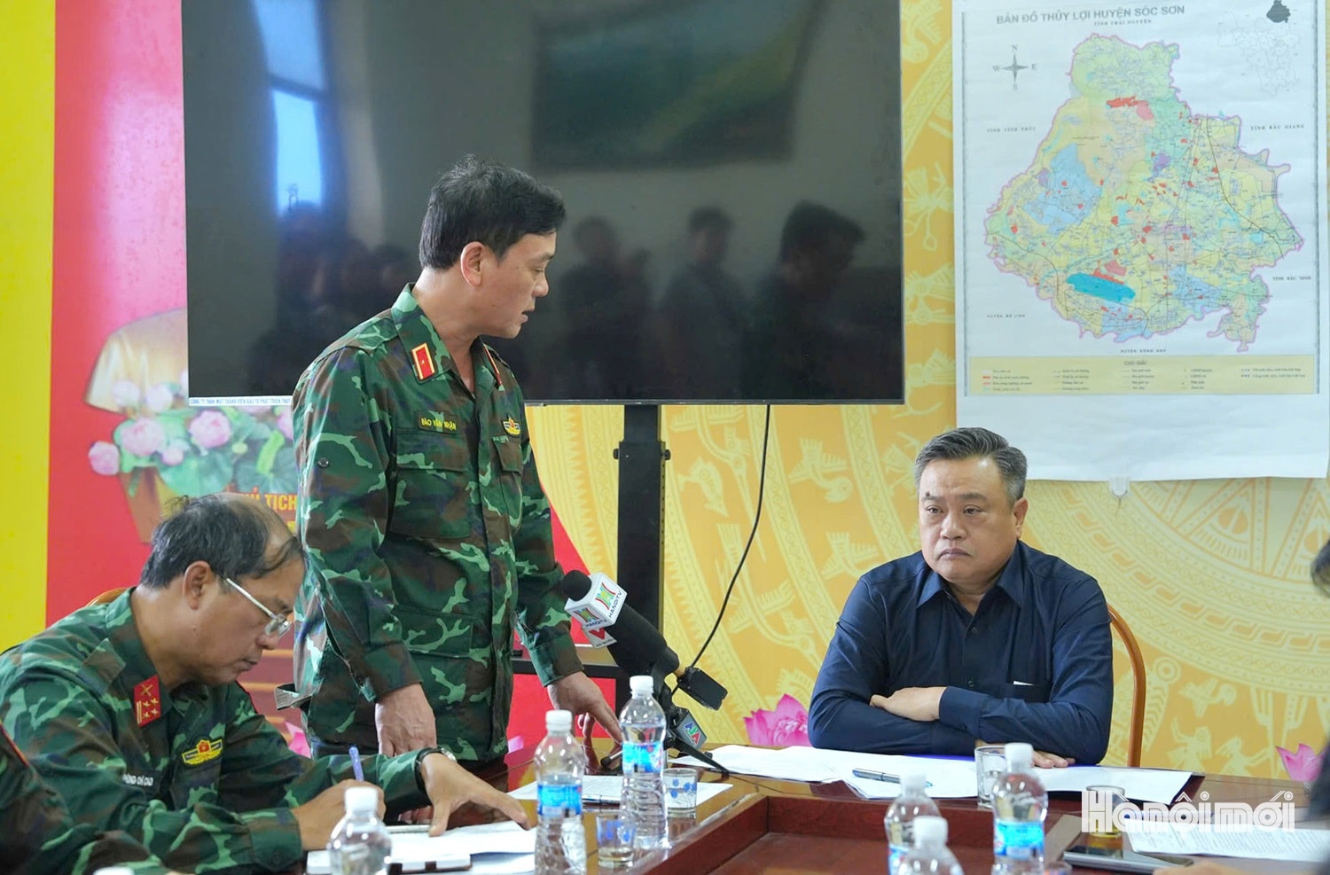 Trước khi đi kiểm tra thực địa, Chủ tịch UBND thành phố Hà Nội Trần Sỹ Thanh nghe báo cáo của các đơn vị trực chiến phòng, chống lũ lụt.