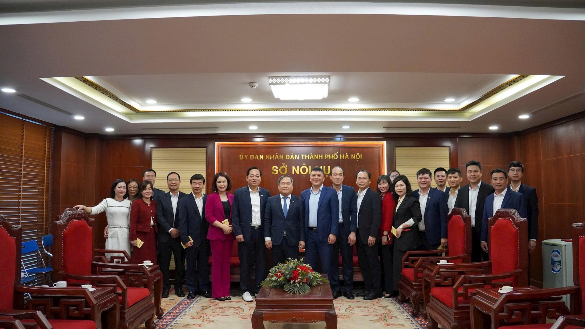 Chủ tịch UBND thành phố Hà Nội Vũ Đại Thắng cùng Đoàn công tác của thành phố chụp ảnh lưu niệm với tập thể cán bộ Sở Nội vụ Hà Nội. Ảnh: CTV
