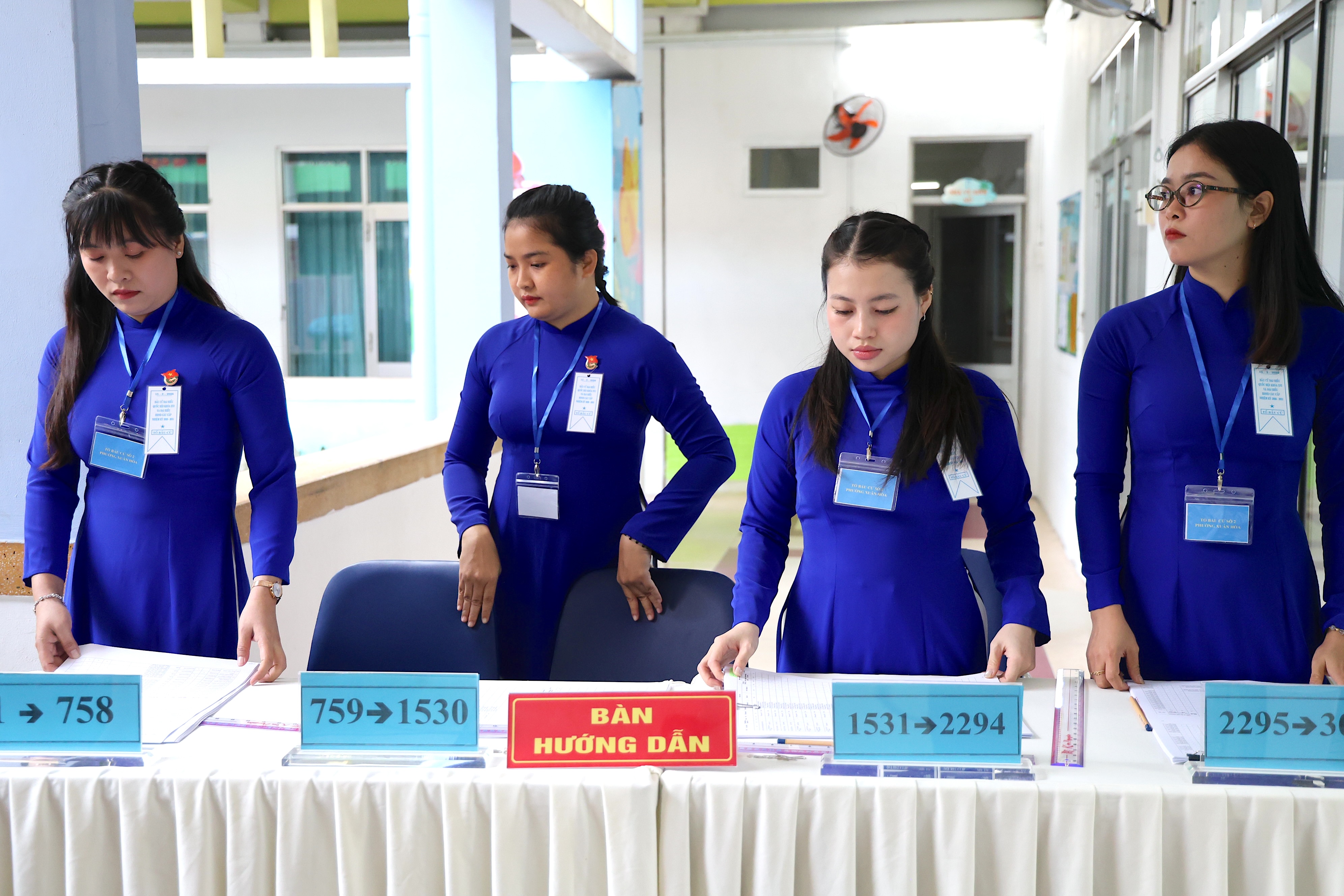 Tổ bầu cử số 2 thực hiện hướng dẫn cử tri. Ảnh: LÊ THOA