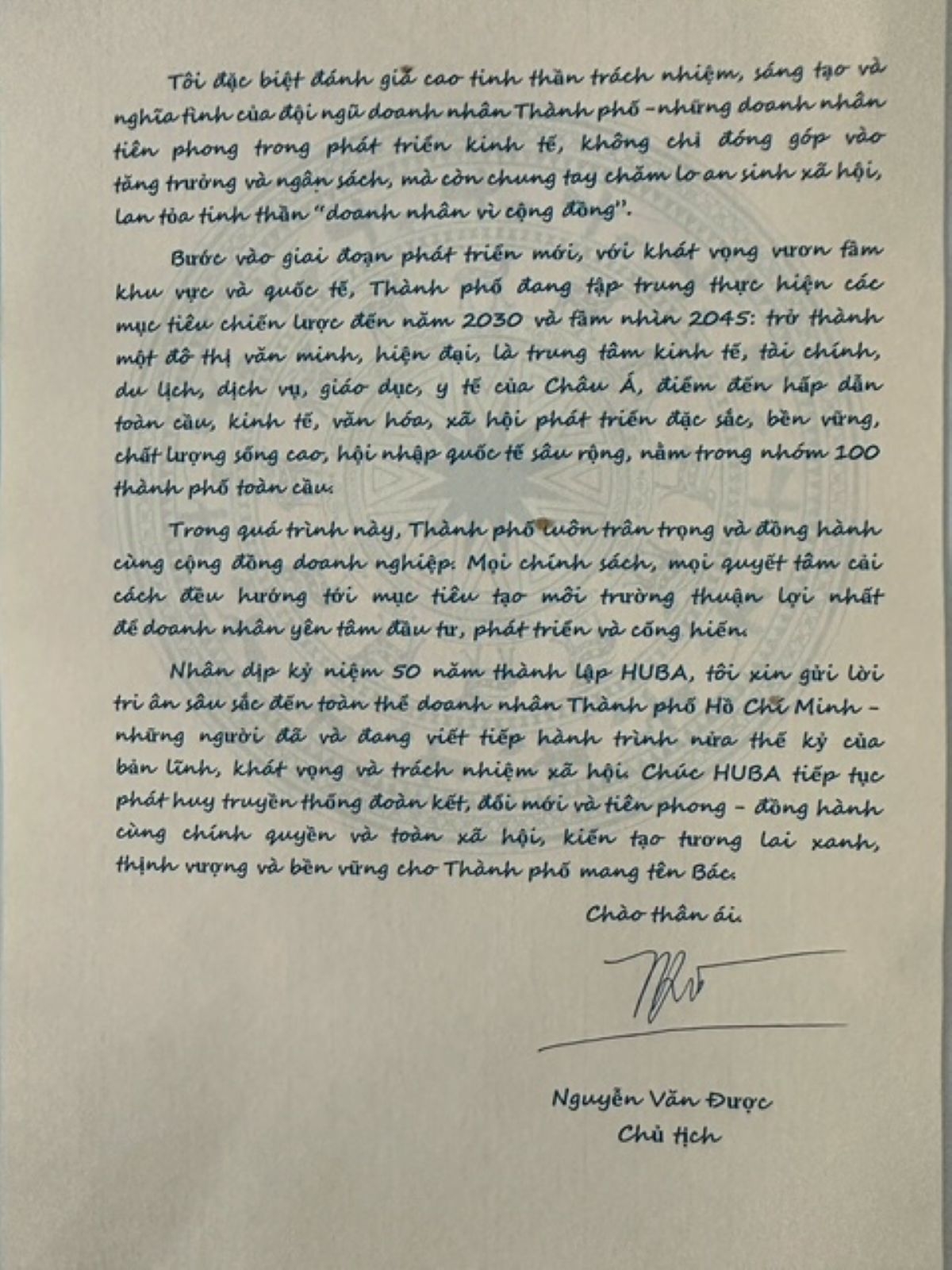 Thư của ông Nguyễn Văn Được, Chủ tịch UBND TP.HCM gửi thư chúc mừng cộng đồng doanh nhân, doanh nghiệp Thành phố (Ảnh Huba cung cấp)