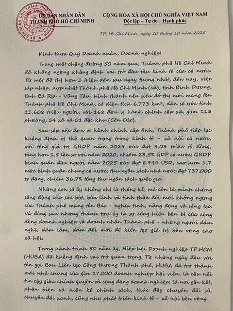Trong thư, Chủ tịch UBND TP nhấn mạnh, 50 năm qua, TP.HCM đã khẳng vai trò đầu tàu kinh tế của cả nước. Sau sáp nhập tổng giá trị GRDP của Thành phố năm 2025 ước đạt 3,03 triệu tỷ đồng, tăng hơn 1,5 lần so với năm 2020, chiếm 23,5% GDP cả nước, GRDP bình quân đầu người năm 2025 ước đạt 8.944 USD, cao hơn 1,7 mức bình quân chung cả nước, thu ngân sách nhà nước đạt 737.000 tỷ đồng, chiếm 36,7% tổng thu ngân sách quốc gia.