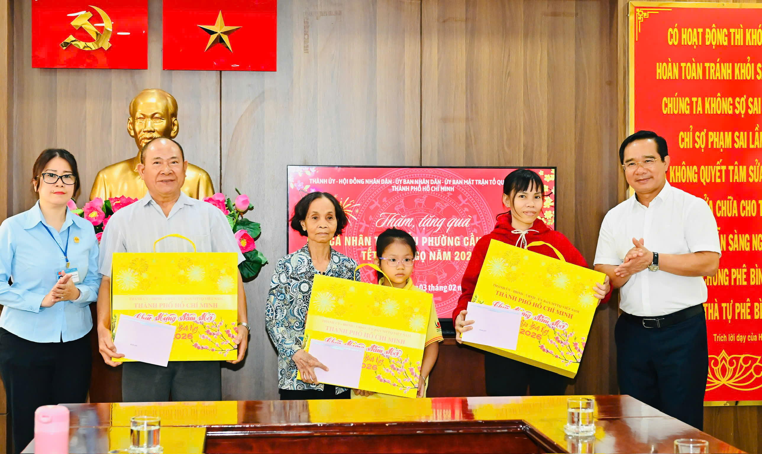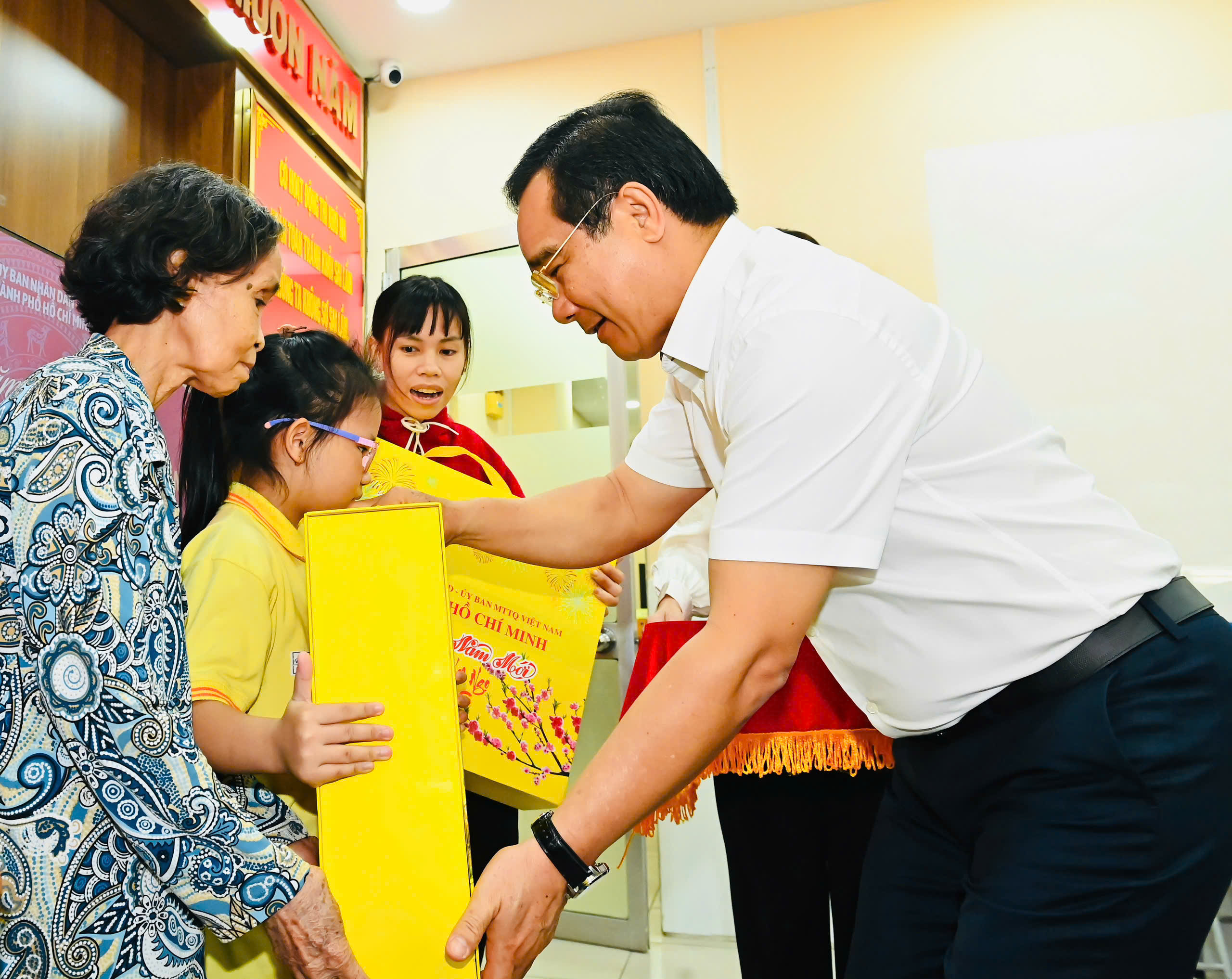 Trao những phần quà tết nghĩa tình đến người dân, Chủ tịch UBND TPHCM gửi lời chúc mừng năm mới an khang, hạnh phúc đến các hộ dân; mong các gia đình tiếp tục nỗ lực vượt qua khó khăn, ổn định cuộc sống.