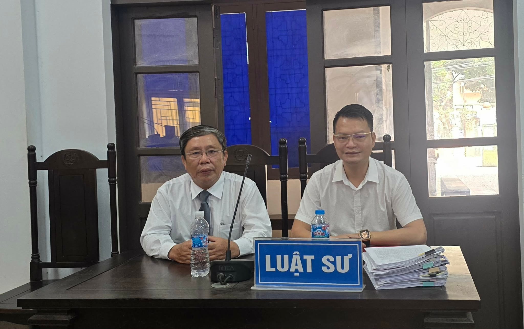 Luật sư Phạm Ngọc Thanh (ngồi bên trái) tham gia bảo vệ quyền và lợi ích hợp pháp của khách hàng tại phiên tòa. Ảnh: Thái An