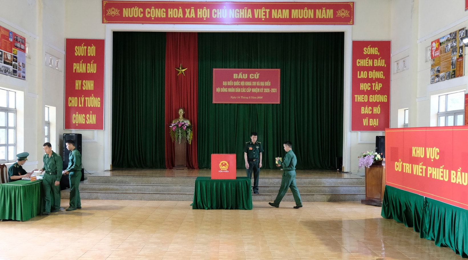 Khu vực bỏ phiếu được bố trí trang trọng, bảo đảm đầy đủ cơ sở vật chất, hệ thống pano, khẩu hiệu, danh sách cử tri, tiểu sử tóm tắt của các ứng cử viên và các điều kiện cần thiết phục vụ cử tri tham gia bỏ phiếu.