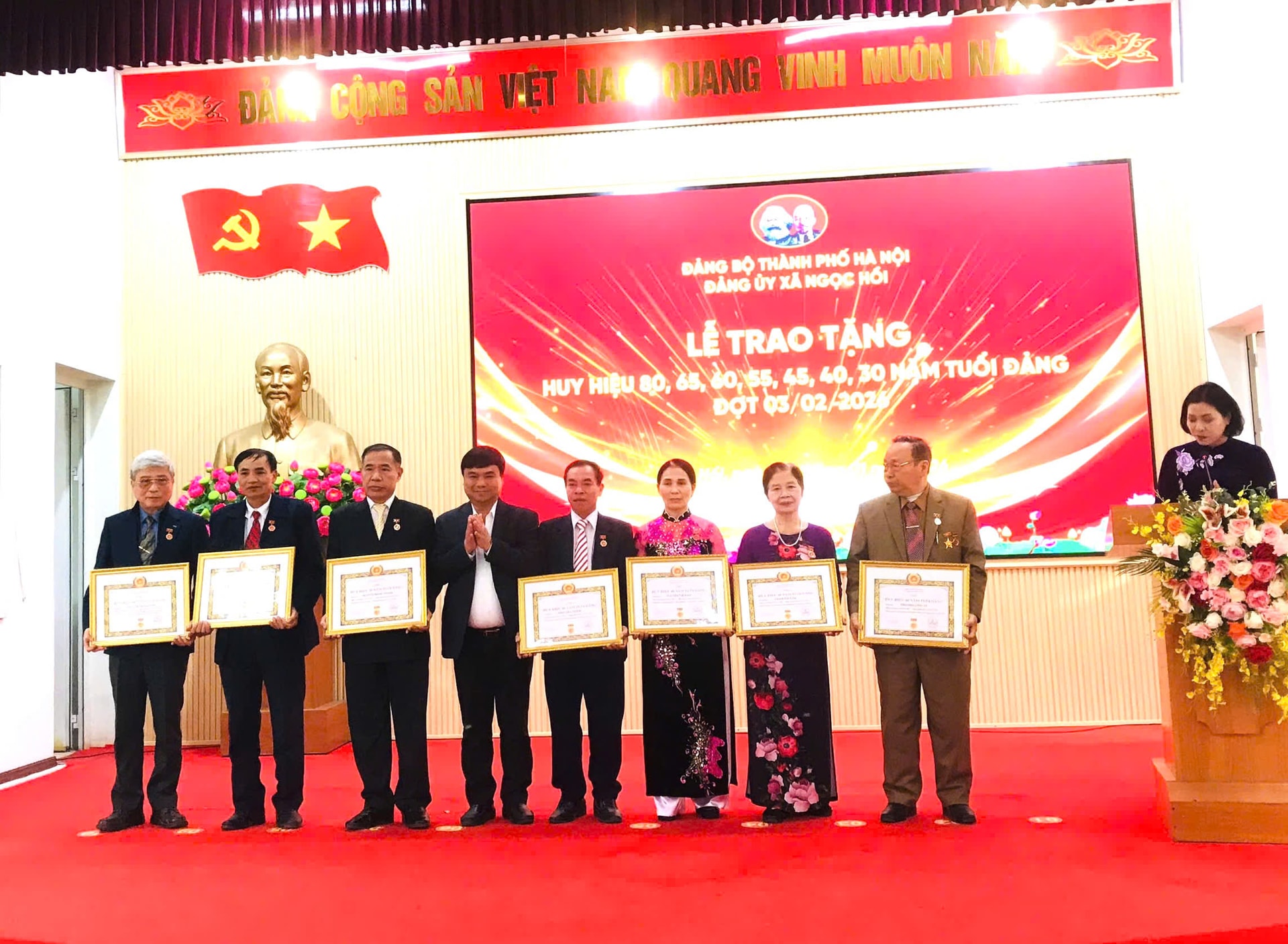 Trong đợt trao Huy hiệu Đảng lần này, Đảng bộ xã Ngọc Hồi có 32 đảng viên vinh dự được trao tặng Huy hiệu Đảng. Trong đó có 1 đồng chí được tặng Huy hiệu 80 năm tuổi Đảng; 1 đồng chí được tặng Huy hiệu 65 năm tuổi Đảng; 2 đồng chí được tặng Huy hiệu 60 năm tuổi Đảng; 2 đồng chí được tặng Huy hiệu 55 năm tuổi Đảng; 12 đồng chí được tặng Huy hiệu 45 năm tuổi Đảng; 7 đồng chí được tặng Huy hiệu 40 năm tuổi Đảng và 7 đồng chí được tặng Huy hiệu 30 năm tuổi Đảng.
