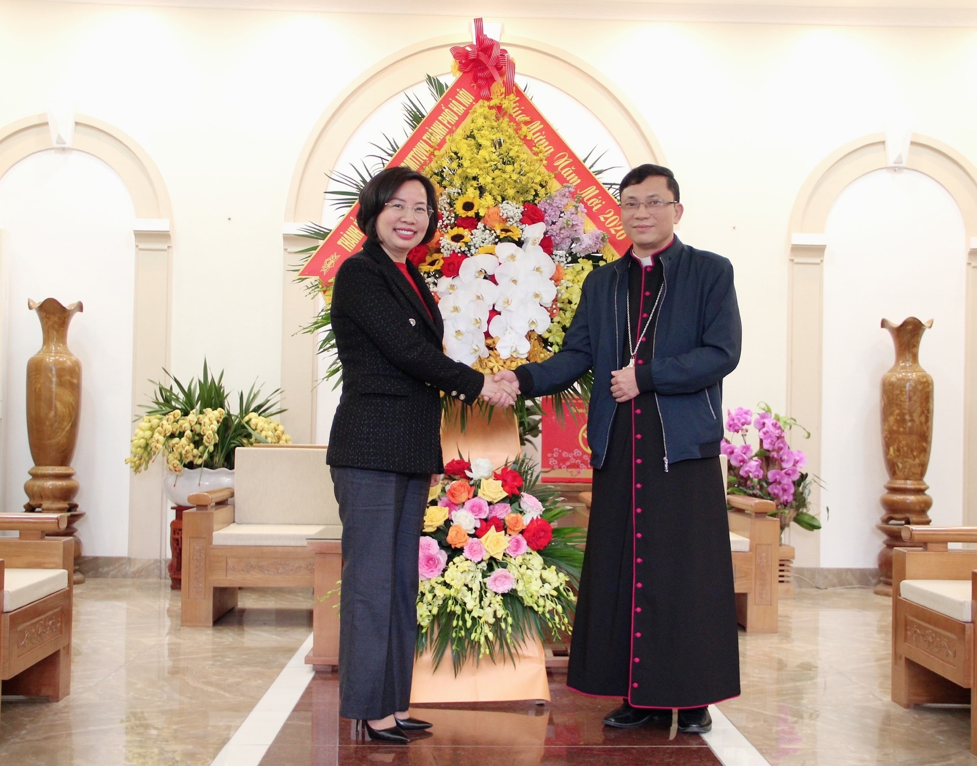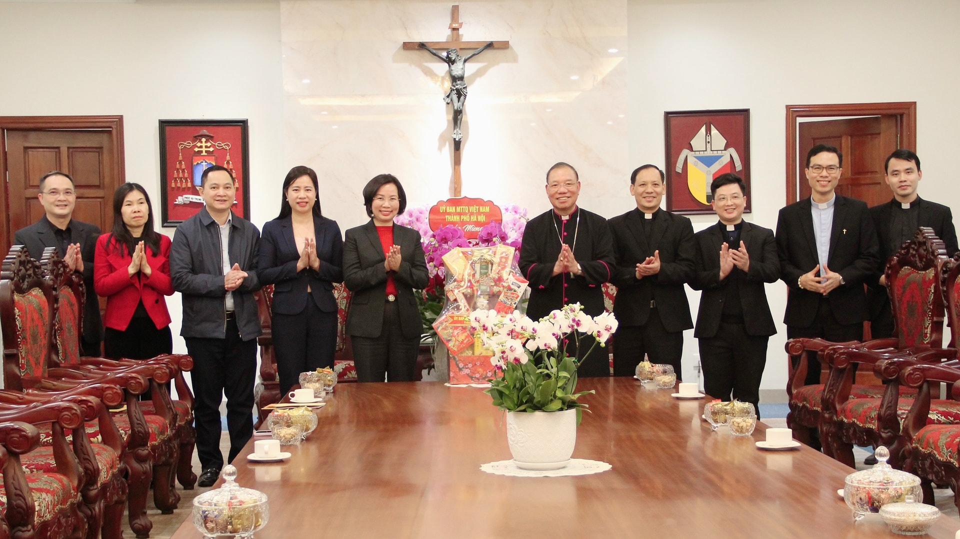 Đến thăm, chúc Tết Tổng Giáo phận Hà Nội, Chủ tịch Ủy ban MTTQ Việt Nam thành phố Bùi Huyền Mai trân trọng gửi tới Đức Tổng Giám mục Giuse Vũ Văn Thiên cùng các linh mục, tu sĩ và đồng bào công giáo lời chúc mừng năm mới, xuân Bính Ngọ sức khỏe, bình an, tràn đầy hồng ân Thiên chúa.