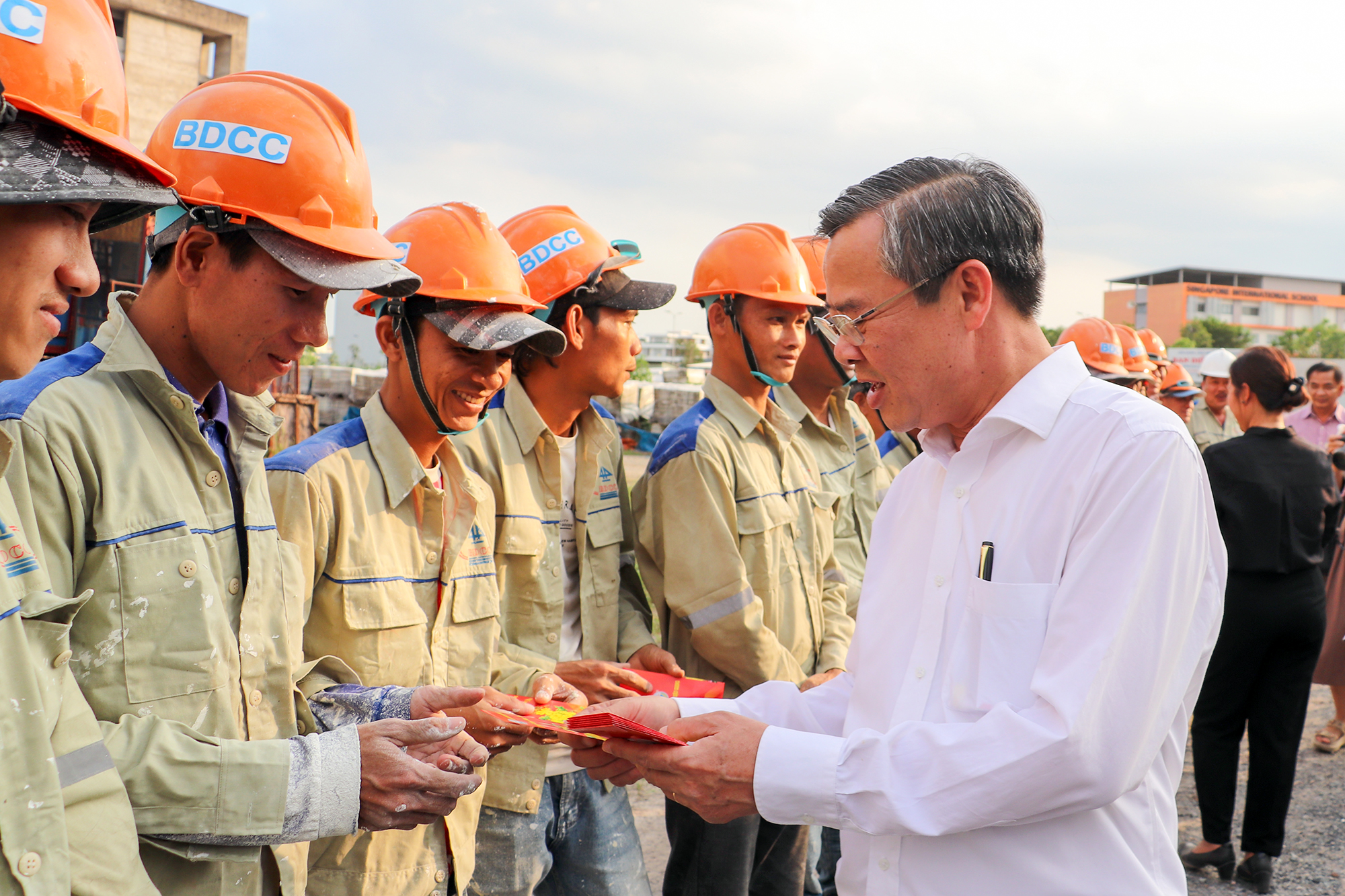 Sau khi khảo sát một lượt công trình, lãnh đạo TP đã động viên, tặng quà lực lượng công nhân thi công tại công trường, mong nhà thầu tăng ca, huy động nguồn lực để sớm hoàn thành dự án, đưa công trình vào sử dụng.