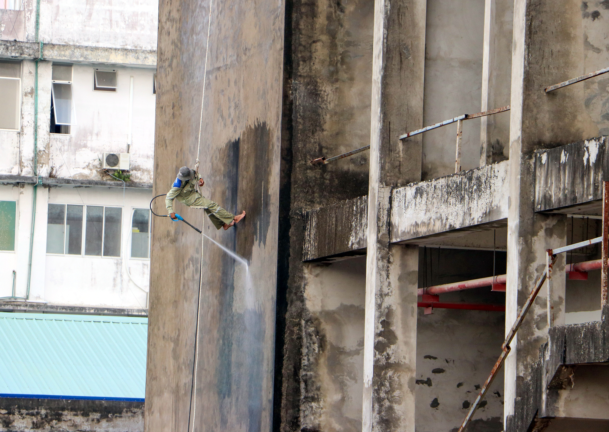 Công nhân vệ sinh rêu mốc trên tường. Ảnh: CHÂU ANH