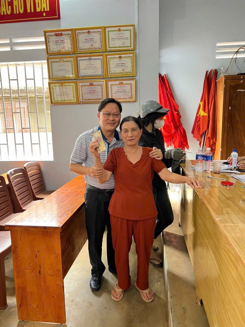 Chủ tịch UBND xã Dray Bhăng Nguyễn Phước Toàn chụp ảnh cùng một người dân địa phương đến nhận quà dịp kỷ niệm 80 năm Cách mạng Tháng Tám và Quốc khánh 2/9.