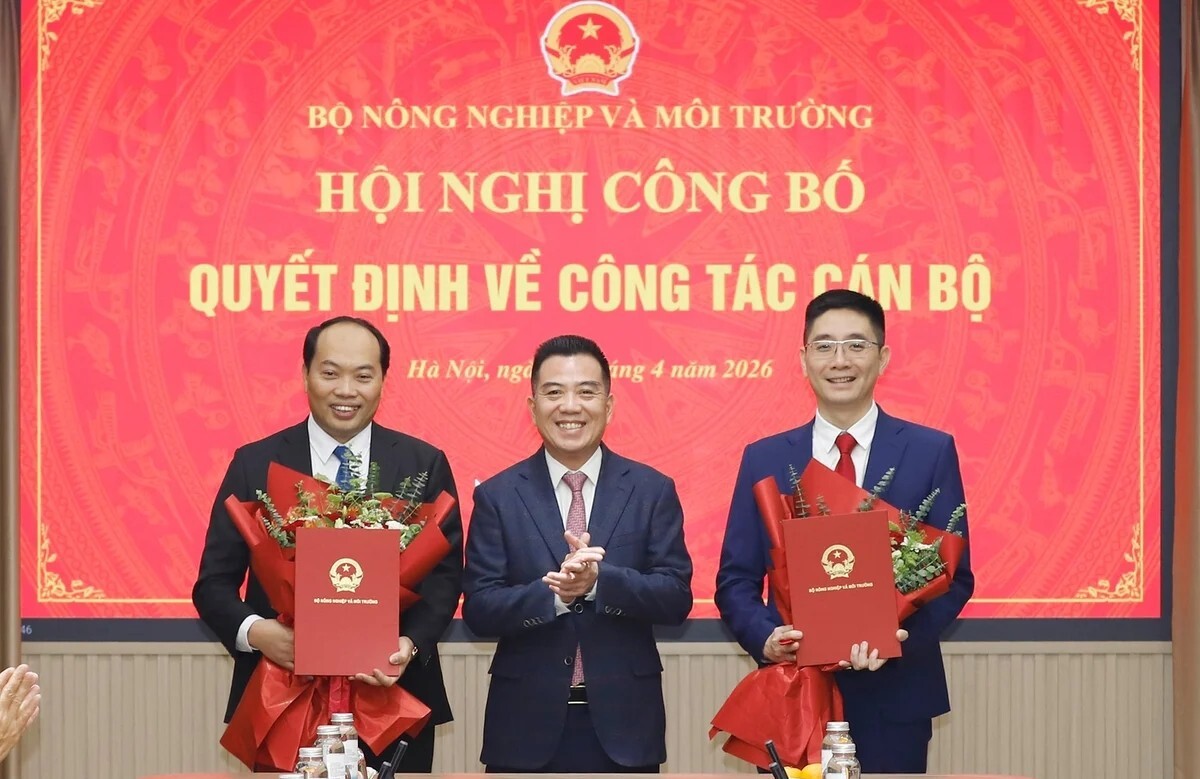 Thứ trưởng Đặng Ngọc Điệp trao Quyết định và tặng hoa cho Chánh văn phòng Bộ Nguyễn Xuân Chinh (ảnh trái) và Tiến sĩ kinh tế Phạm Hoài Nam (ảnh phải) làm Thư ký Bộ trưởng Bộ Nông nghiệp và Môi trường. (Ảnh: Khương Trung)