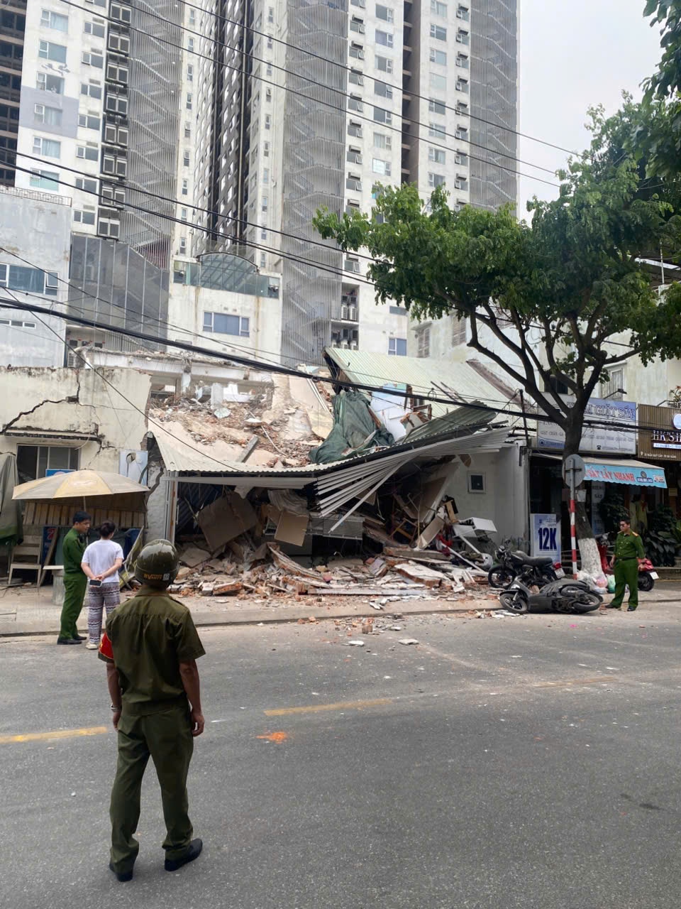 Chỉ kịp cầm theo điện thoại, hai người chạy ra khỏi quán, đồng thời hô hoán cho hàng xóm hai bên. Chỉ ít giây sau khi mọi người chạy sang được bên kia đường, tiệm bánh, cũng là nơi ở vợ chồng chị Văn thuê, đổ sập. Tiệm giặt là và tiệm may đồ sát hai bên bị sập một phần phía sau nhà.