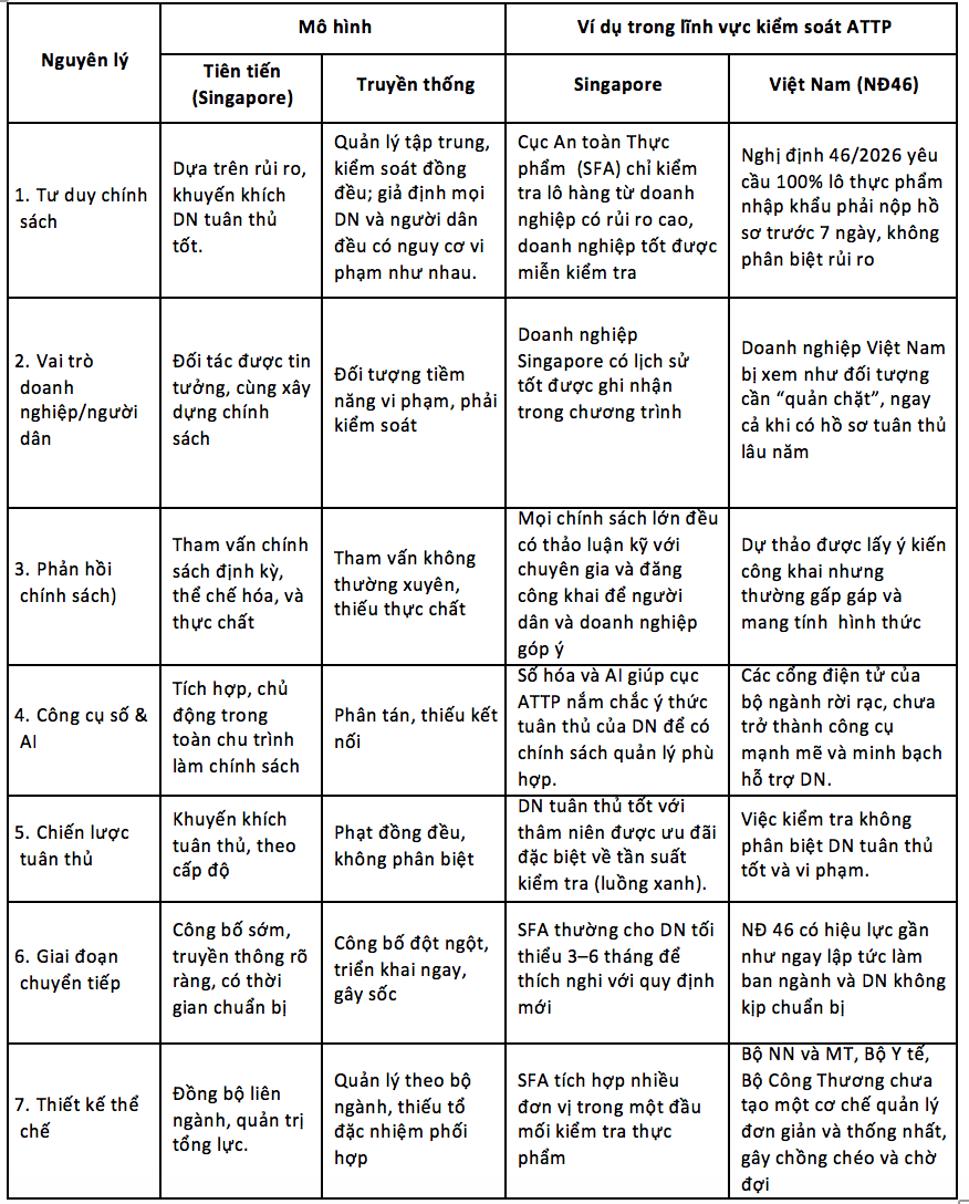 Các quốc gia tiến nhanh đến hùng cường (như Singapore, Hàn Quốc…) đã và đang áp dụng nhất quán 7 nguyên lý xây dựng chính sách tiên tiến. Quản lý an toàn thực phẩm nhập khẩu là một lĩnh vực điển hình thể hiện rõ sự khác biệt giữa cách làm chính sách truyền thống và tư duy thể chế hiện đại.
