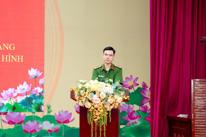 Trung tá Ngô Anh Đức – Trưởng Công an xã Kim Anh báo cáo tại hội nghị