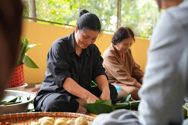 Đặc biệt, nơi góc bếp chùa Bằng, không khí Tết cổ truyền hiện hữu rõ nét và ấm áp hơn bao giờ hết. Bên bếp lửa hồng rực, chư Tăng cùng Phật tử quây quần gói bánh chưng chay. Mùi nếp mới quyện cùng hương lá dong, khói bếp lan tỏa trong tiết trời se lạnh cuối năm, gợi lên cảm giác sum vầy, chan chứa nghĩa tình.