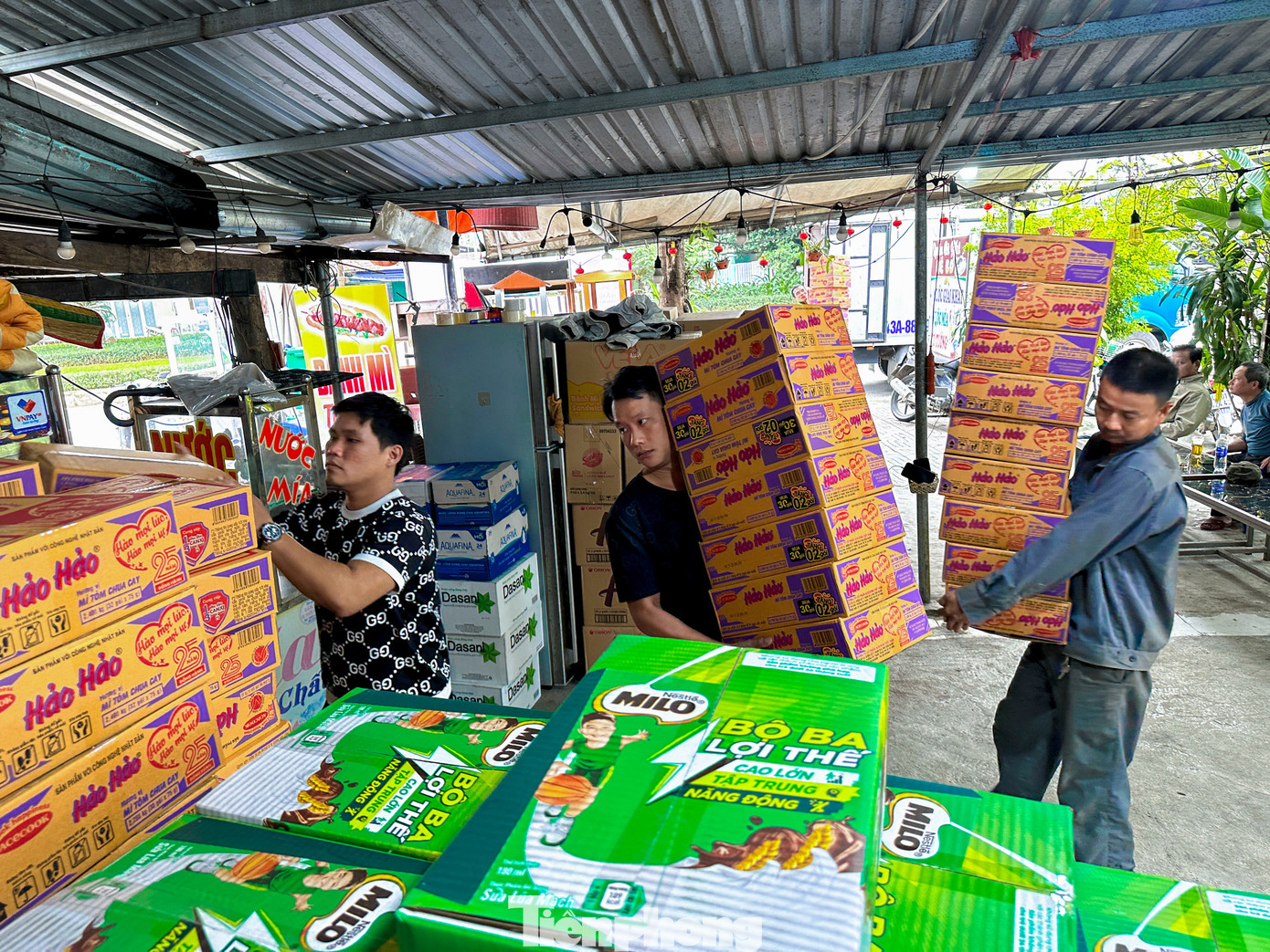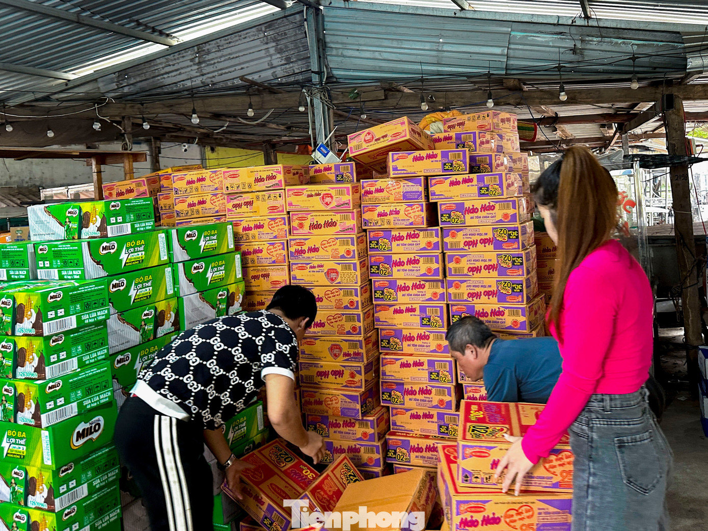 Nhiều người tất bật bốc xếp hàng hóa, các em nhỏ cũng vui vẻ phụ giúp.