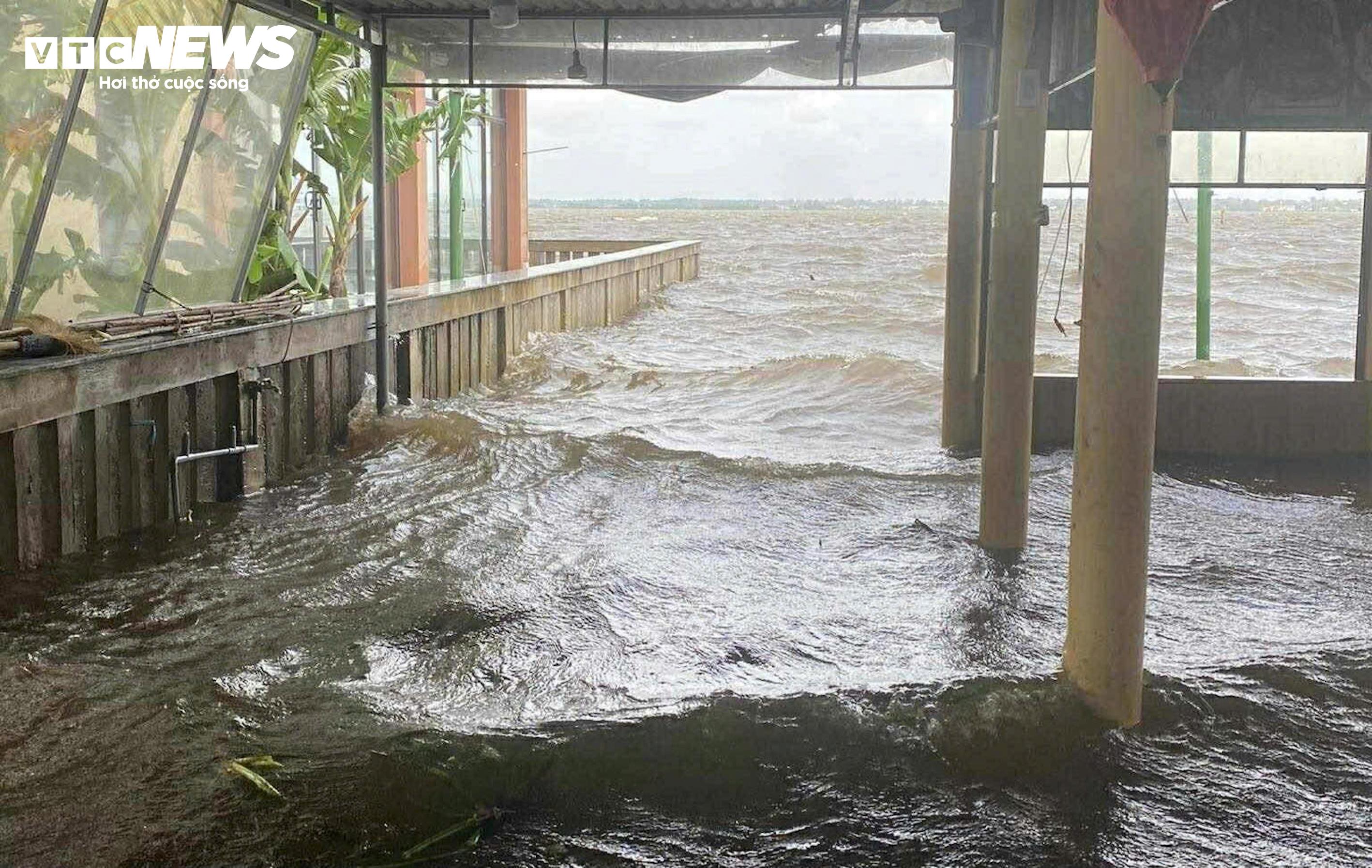 Bão số 12 gây triều cường, nhiều hàng quán ven đầm phá Tam Giang ngập sâu.