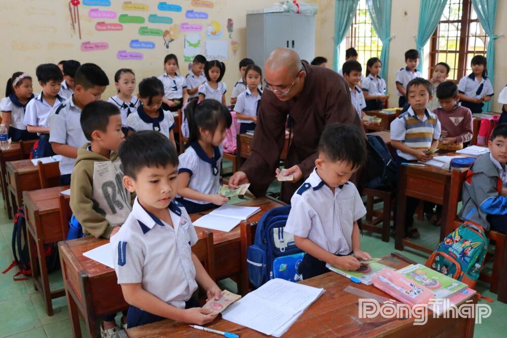 Trao tiền cho học sinh Trường Tiểu học Hòa Thắng 1.
