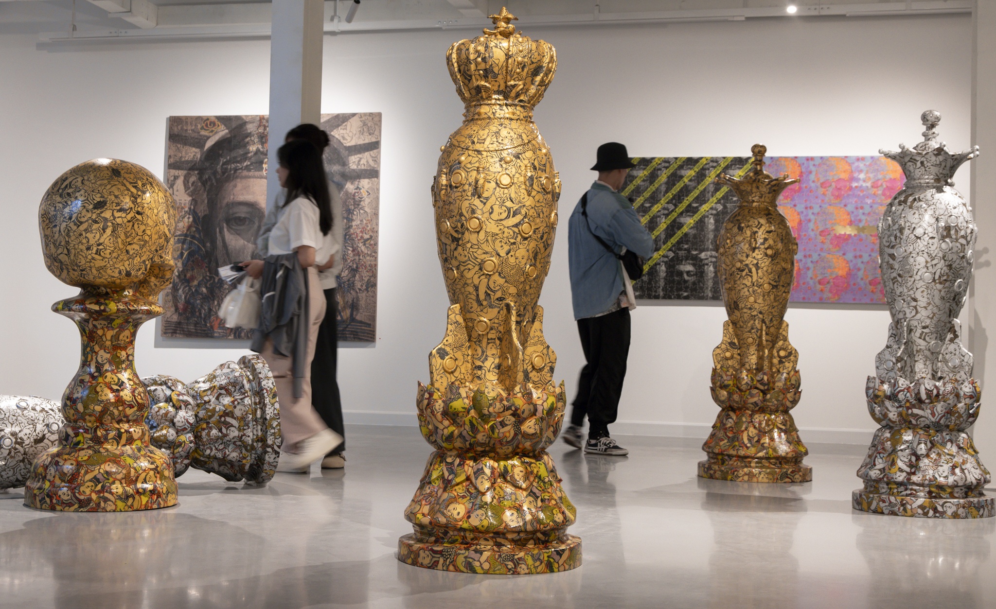Ngoài ra, các tác phẩm điêu khắc được trưng bày trong triển lãm này có hình dạng giống quả bom và các quân cờ - những ẩn dụ 3 chiều cho cuộc đấu trí hạt nhân ngày nay.