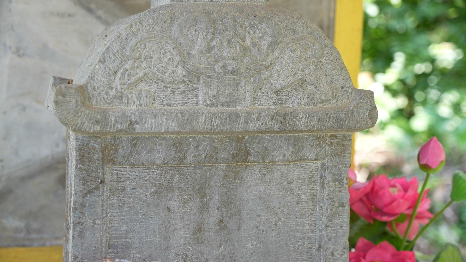 Chùa Sùng Nghiêm có kiến trúc, quy mô bề thế, có tiền đường, hậu cung, sân rồng... Hiện nay, ngoài các hiện vật cổ như: Bàn thờ đá, bệ đá, bát hương đá, các bài chế vua ban cho anh em dòng họ Nguyễn Huy, bia công đức; trong khuôn viên chùa còn lưu giữ được những tấm bia đá. Những tấm bia này có kích thước tương đối đồng đều. Thân bia đá khắc chữ, phần mũ, đế và diềm bia được chạm khắc họa tiết tỉ mỉ, đẹp mắt. Đây là chứng nhân lịch sử, tư liệu Hán - Nôm đặc sắc.