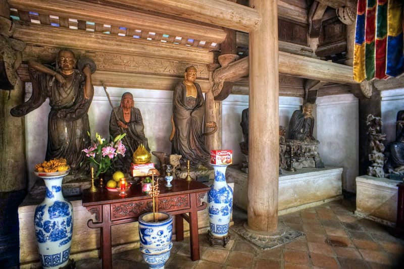 Chùa có 72 pho tượng, được tạc bằng gỗ mít sơn son thếp vàng. Nhiều pho tạc cao hơn người thật như 8 pho tượng Kim Cương và Hộ Pháp, cao chừng 3m, trang nghiêm phúc hậu. Phần lớn các tượng đều được coi là có niên đại cuối thế kỷ 18. Một số tượng khác được tạc vào giữa thế kỷ 19.