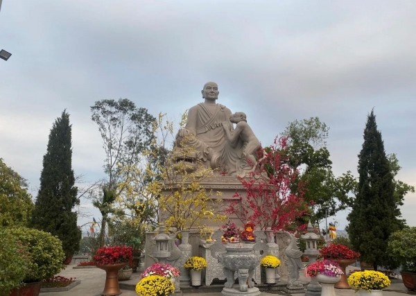 Trong ánh sáng mờ dịu của gian thờ, mùi hương thơm của nhang trầm, của các loài hoa dâng cúng xen lẫn với hương hoa lan đến ngạt ngào, pho tượng thiền sư hiện lên trầm mặc. Ngài ngồi đó, thật xa cũng thật gần, an nhiên mà tĩnh tại, khuôn mặt thần thái ôn hòa nhu ái, đôi tay đặt trong tư thế định tâm, khí lành bao phủ khắp gian phòng.