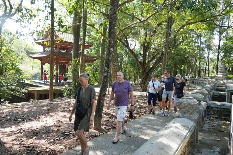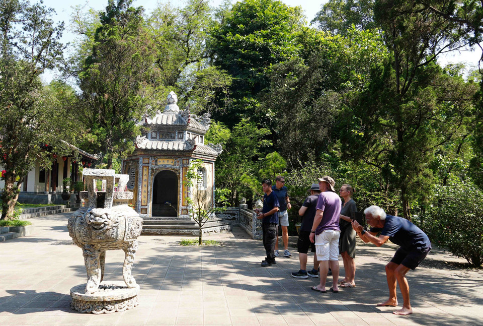 Du khách quốc tế tham quan trong khu vực chùa Từ Hiếu, phường Thủy Xuân, thành phố Huế. (Ảnh: Nguyên Lý/TTXVN)