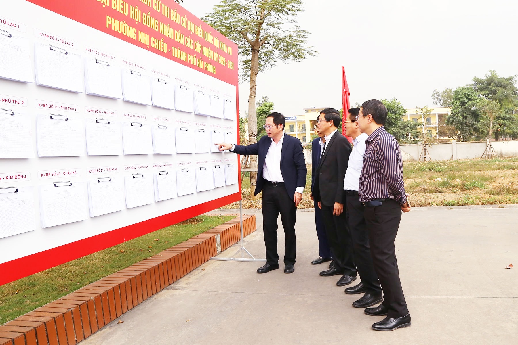 Đoàn kiểm tra của Ủy ban bầu cử thành phố Hải Phòng kiểm tra khu vực dự kiến bỏ phiếu trên địa bàn phường Nhị Chiểu. Ảnh: Nguyễn Hải