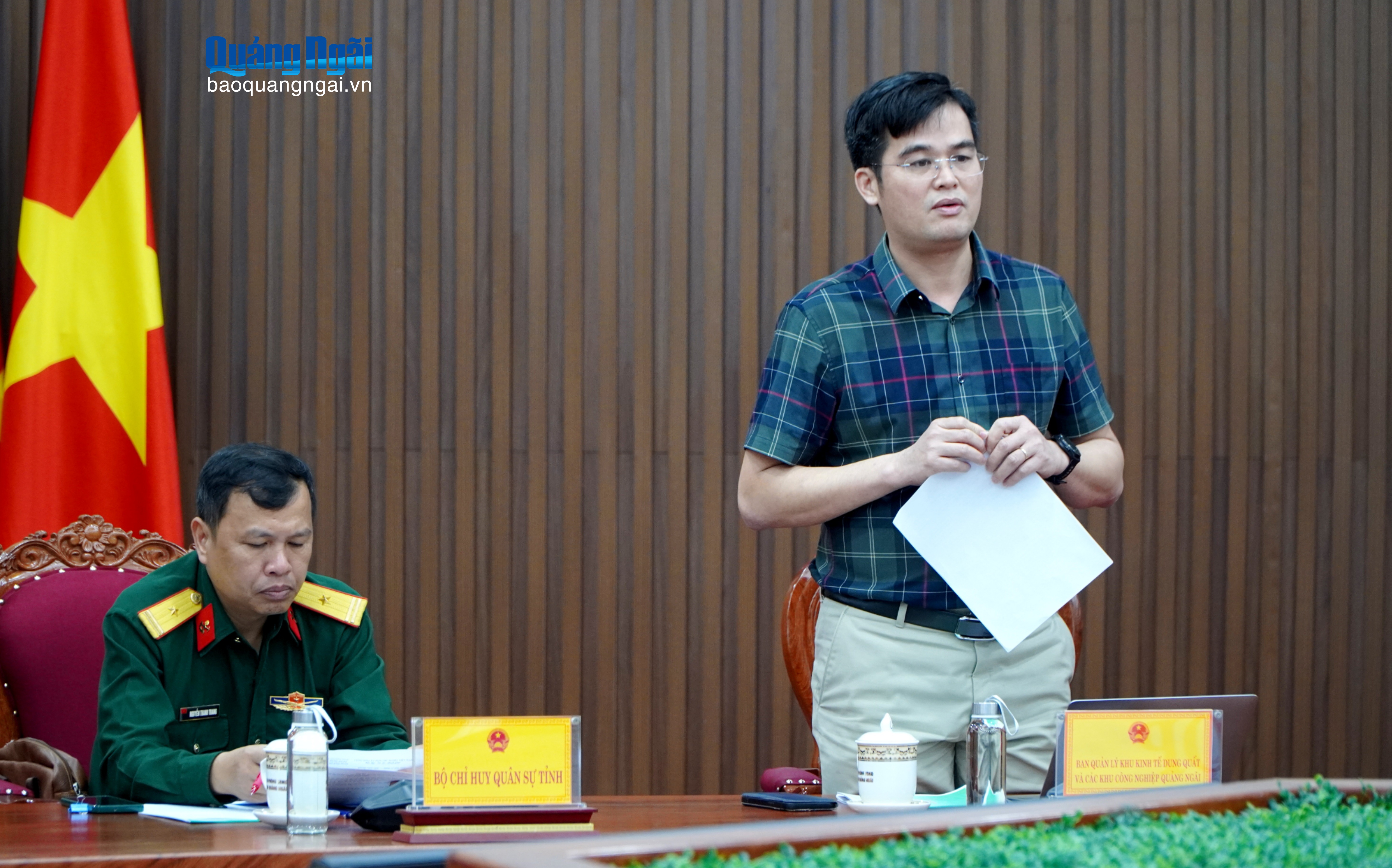 Phó Trưởng Ban Quản lý KKT Dung Quất và các KCN Quảng Ngãi Nguyễn Hải Trường báo cáo công tác phối hợp tổ chức lễ khởi công dự án trong KKT Dung Quất.