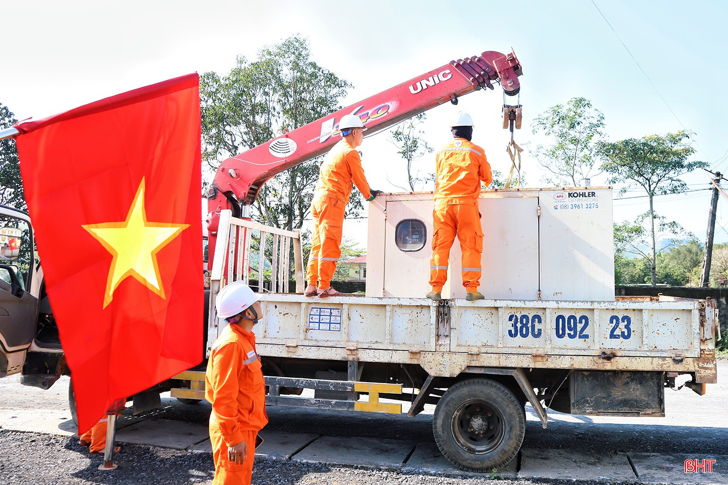 Tại xã Vũ Quang, công tác chuẩn bị đã được hoàn thiện chu đáo, tất cả đã sẵn sàng cho lễ khởi công vào sáng 19/3. Trong ảnh: Đơn vị điện lực chuẩn bị các điều kiện đảm bảo nguồn điện ổn định phục vụ cho lễ khởi công.