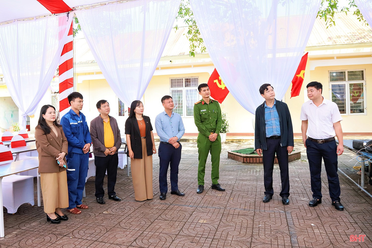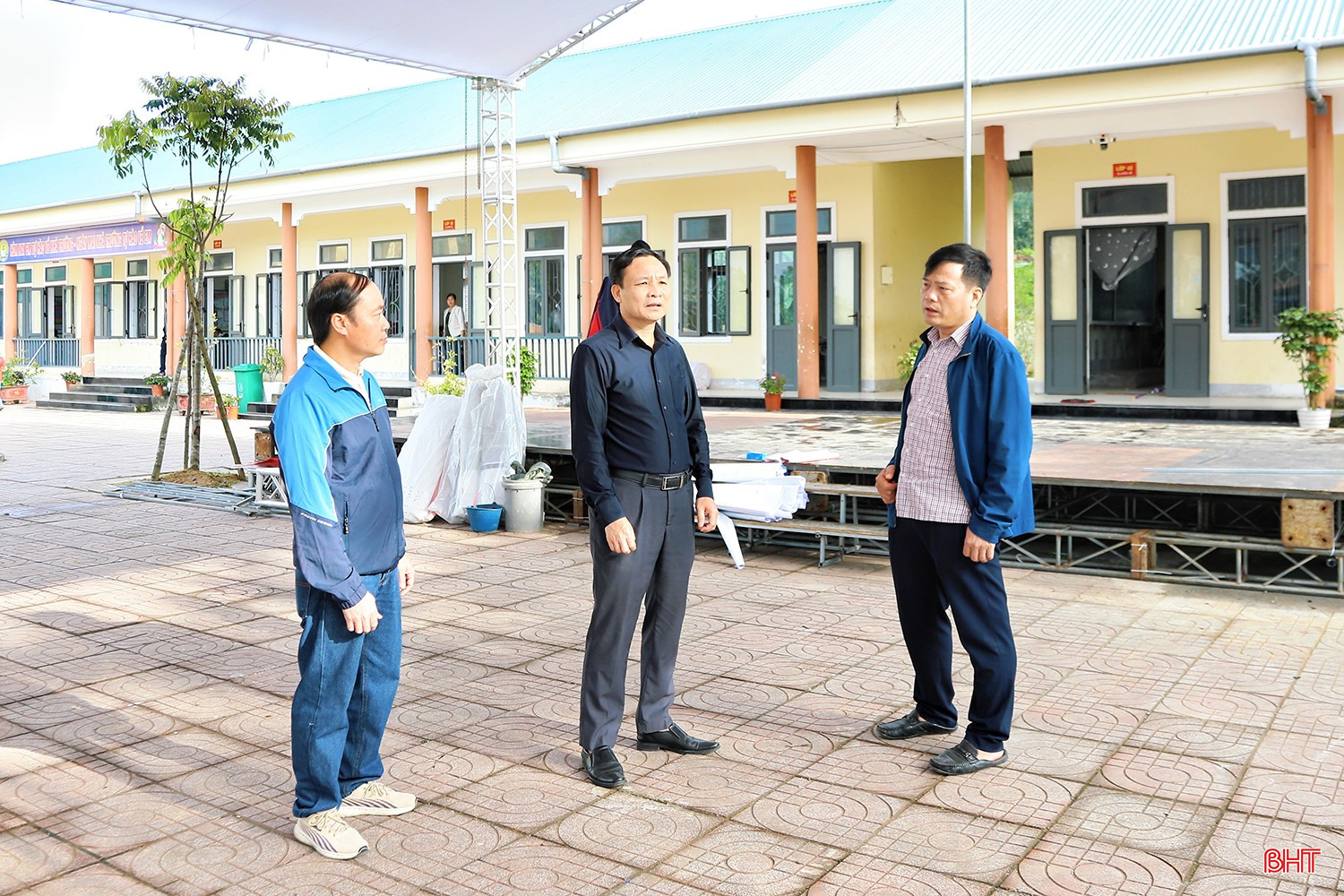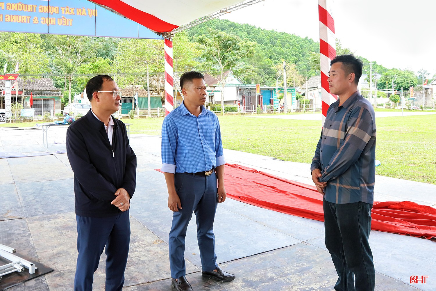 Ông Đặng Tuấn Anh - Chủ tịch UBND xã Hương Xuân (người ở giữa) cho biết: "Địa phương đã huy động cả hệ thống chính trị vào cuộc để đảm bảo mọi công tác được chuẩn bị kỹ lưỡng. Hệ thống điện lưới, phương án dự phòng và vệ sinh môi trường tại khu vực tổ chức lễ khởi công đã được rà soát kỹ, đảm bảo tính thẩm mỹ và trang trọng cho điểm cầu trực tuyến. Mọi công đoạn cuối cùng đang được hoàn tất với tinh thần trách nhiệm cao nhất".