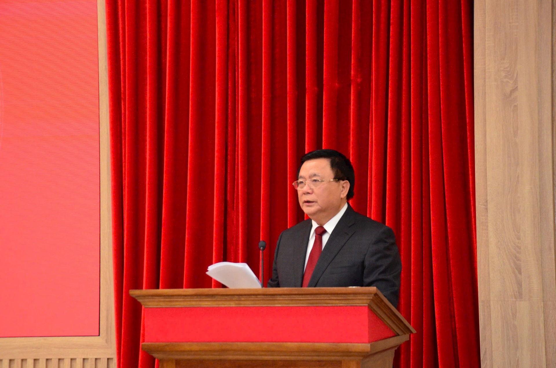 PGS.TS Đoàn Minh Huấn, Giám đốc Học viện Chính trị quốc gia Hồ Chí Minh, Phó Chủ tịch Thường trực Hội đồng Lý luận Trung ương phát biểu tại kỳ họp. Ảnh: Phạm Cường