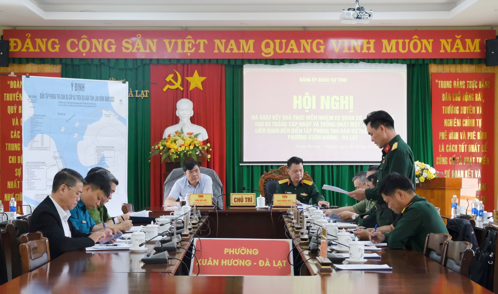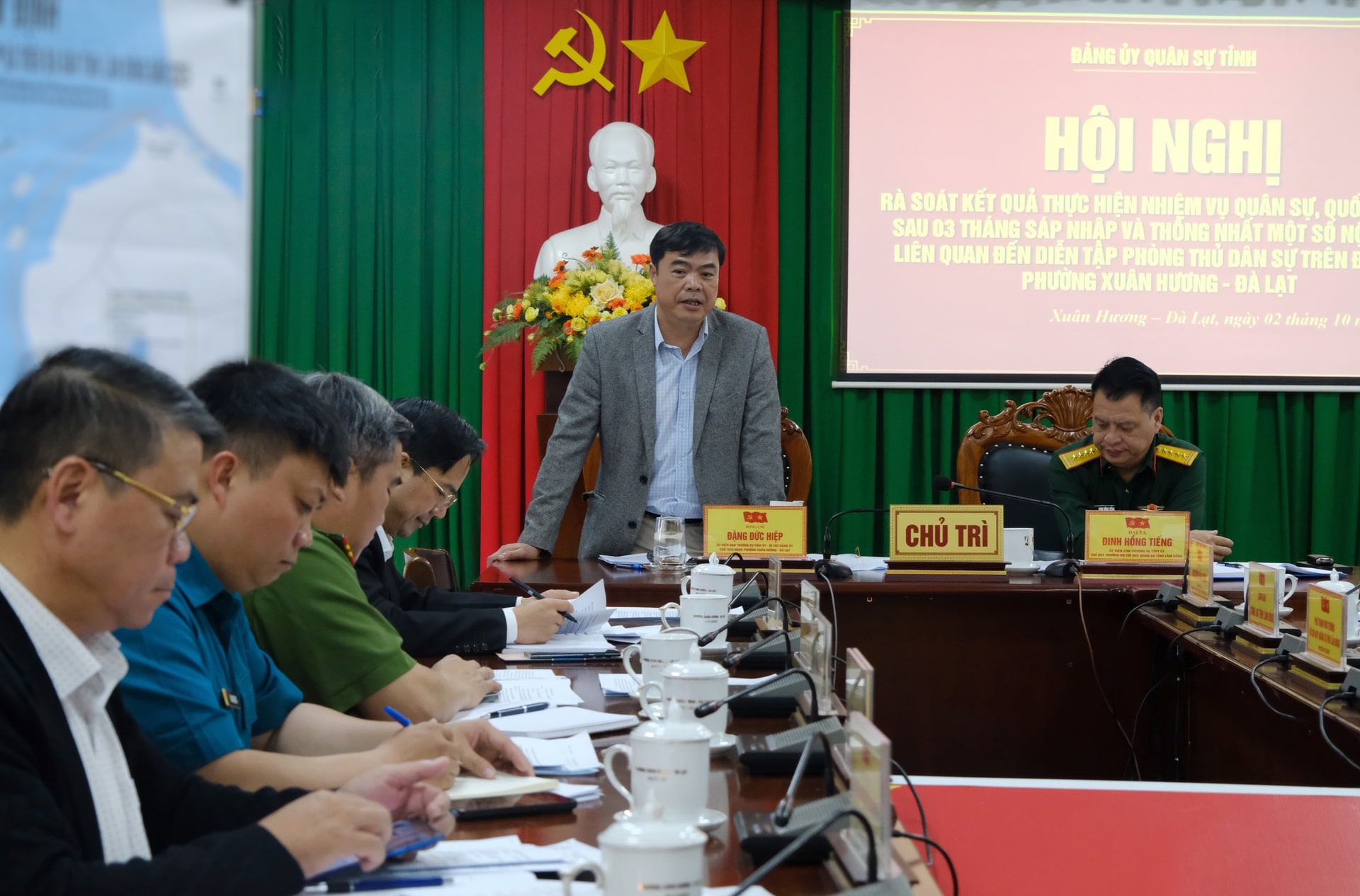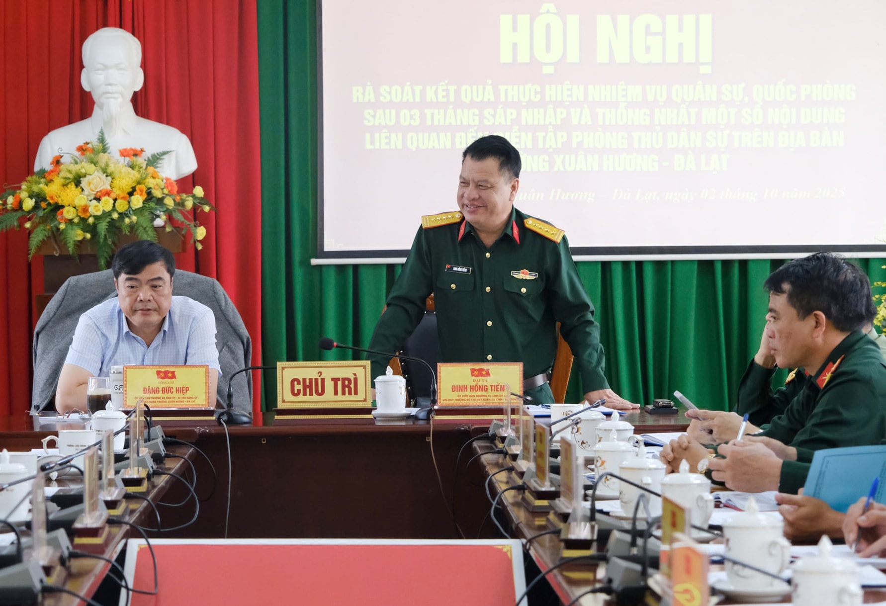 Đại tá Đinh Hồng Tiếng, Ủy viên Ban Thường vụ Tỉnh ủy, Chỉ huy trưởng Bộ CHQS tỉnh và đồng chí Đặng Đức Hiệp, Ủy viên Ban Thường vụ Tỉnh ủy, Bí thư Đảng ủy phường Xuân Hương - Đà Lạt chủ trì buổi làm việc.