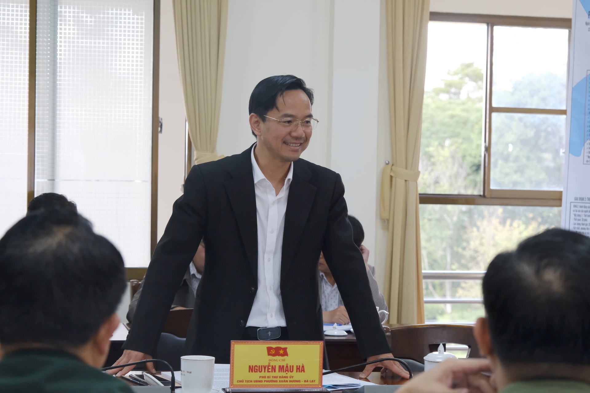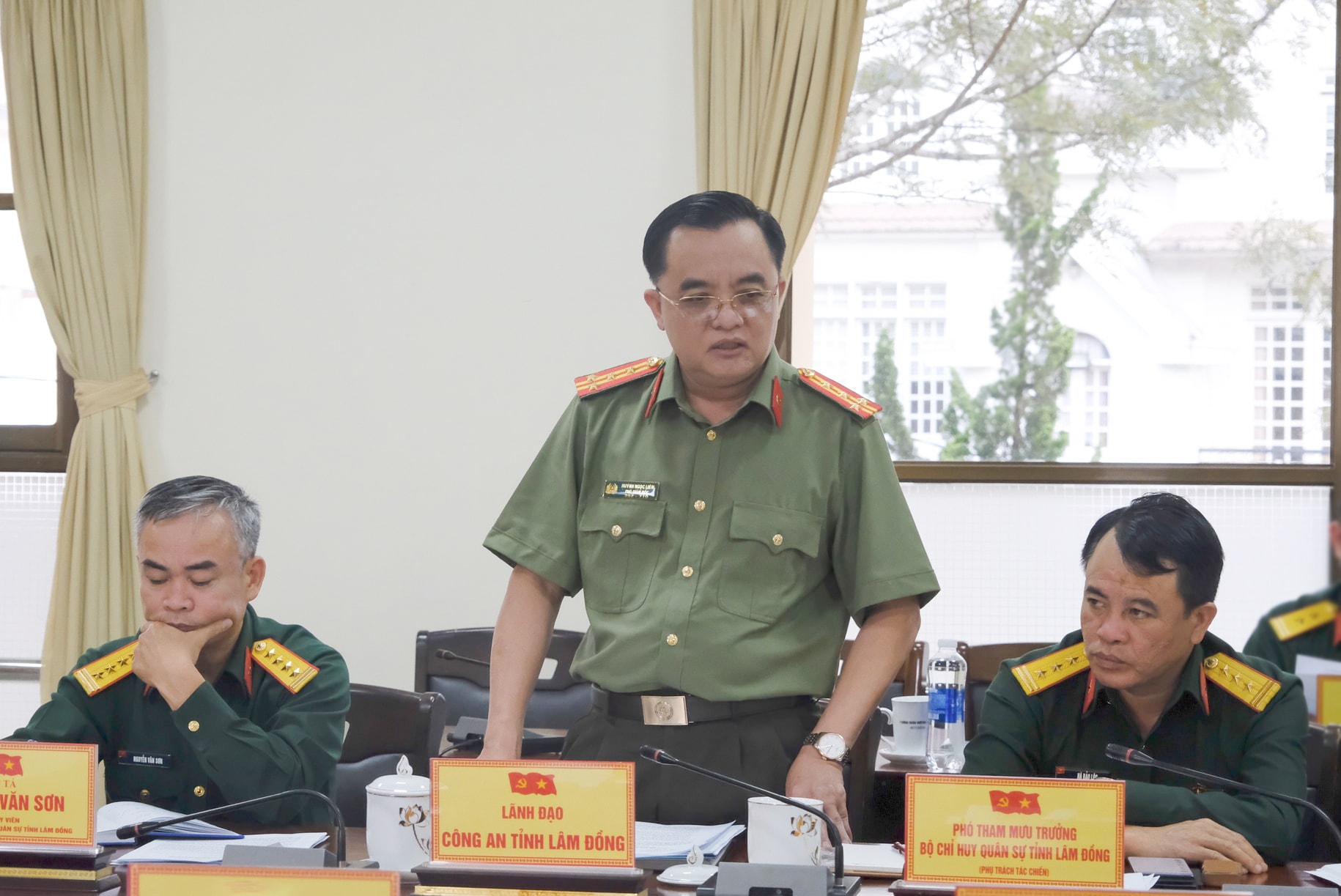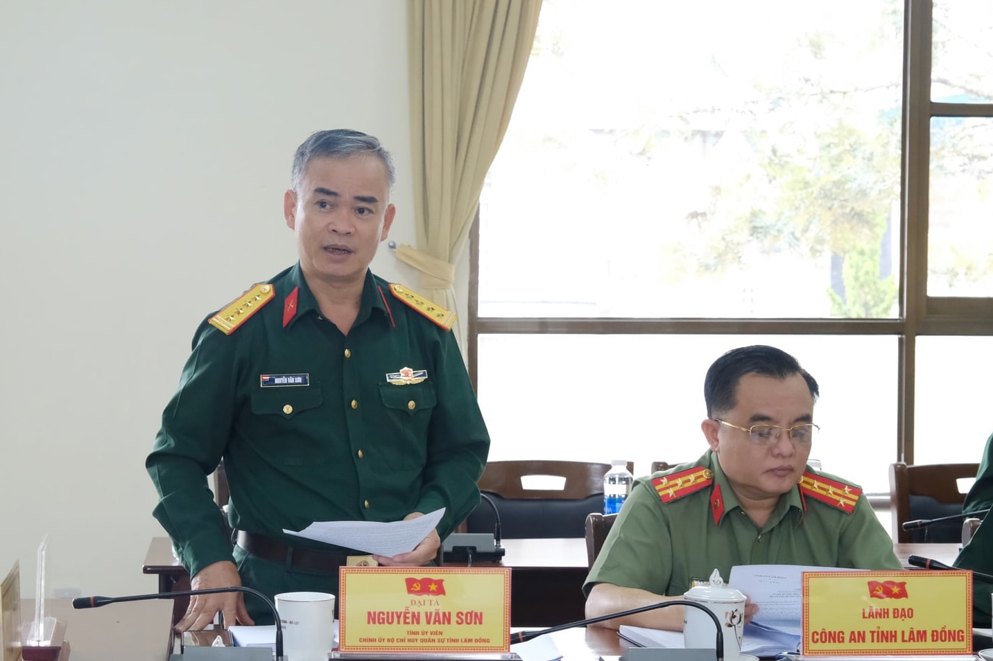 Đại tá Đinh Hồng Tiếng, Ủy viên Ban Thường vụ Tỉnh ủy, Chỉ huy trưởng Bộ CHQS tỉnh và đồng chí Đặng Đức Hiệp, Ủy viên Ban Thường vụ Tỉnh ủy, Bí thư Đảng ủy phường Xuân Hương - Đà Lạt chủ trì buổi làm việc.