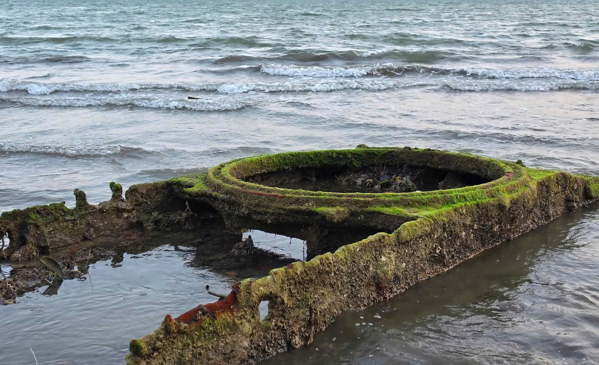 Vật thể nghi xác xe tăng được người dân, du khách phát hiện trồi lên dọc bãi biển Quy Nhơn khi thủy triều rút mạnh. Ảnh: QUỐC CƯỜNG