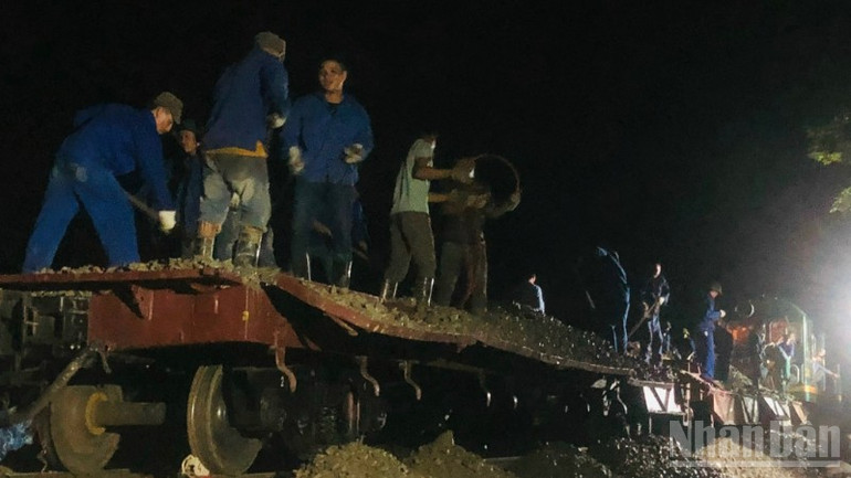 Công nhân đường sắt sửa chữa lại hạ tầng đường sắt sau ảnh hưởng mưa lũ.