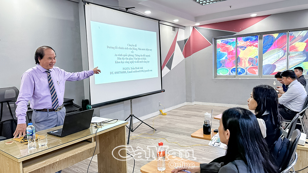 Ngay sau lễ khai giảng, PGS.TS Trần Hoài Anh, giảng viên cao cấp Trường ĐH Văn hóa Tp Hồ Chí Minh, chia sẻ chuyên đề đầu tiên về Đường lối chính sách của Đảng, Nhà nước hiện nay về an ninh quốc phòng, thông tin đối ngoại, dân tộc tôn giáo, văn hóa xã hội, khoa học công nghệ và đổi mới sáng tạo.