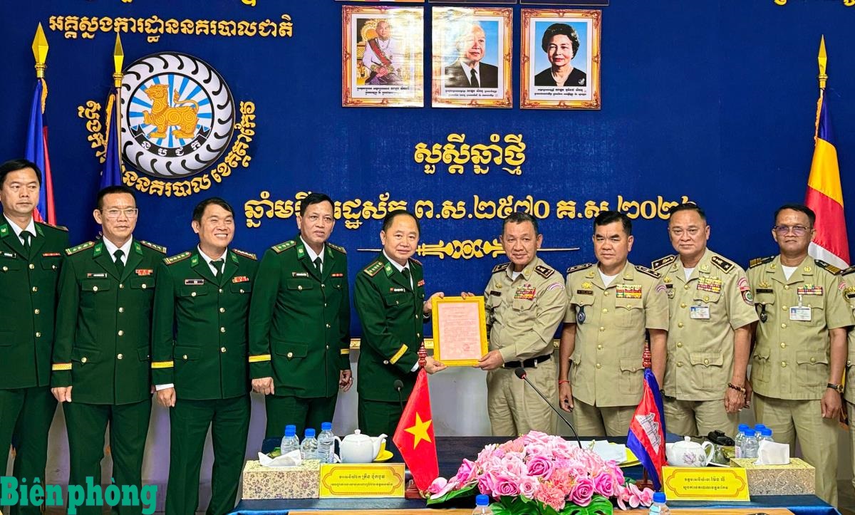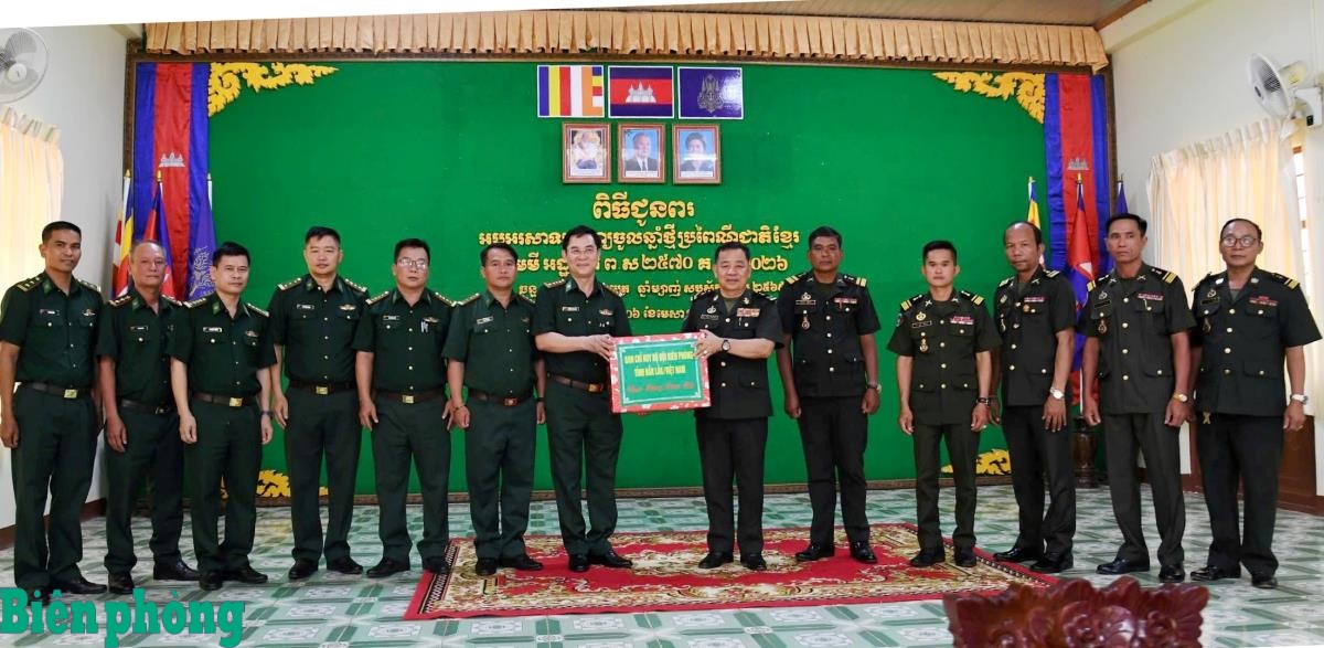 Từ ngày 3 đến 5/4, Ban Chỉ huy Bộ đội Biên phòng tỉnh An Giang đã tổ chức các đoàn công tác sang thăm, chúc Tết và tặng quà lực lượng vũ trang Vương quốc Campuchia nhân dịp Tết cổ truyền Chol Chnam Thmay. Tại các nơi đến thăm, đại diện Ban Chỉ huy Bộ đội Biên phòng tỉnh An Giang đã gửi lời chúc mừng năm mới tới toàn thể cán bộ, chiến sĩ và nhân dân Campuchia; đồng thời bày tỏ mong muốn các lực lượng hai bên tiếp tục duy trì hiệu quả cơ chế hội đàm định kỳ, tăng cường trao đổi thông tin, phối hợp xử lý kịp thời các vụ việc phát sinh trên biên giới trên tinh, không để hình thành “điểm nóng”. Ảnh: Minh Trí