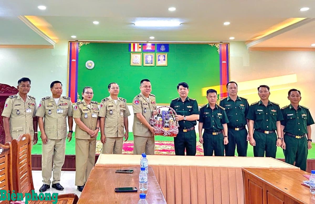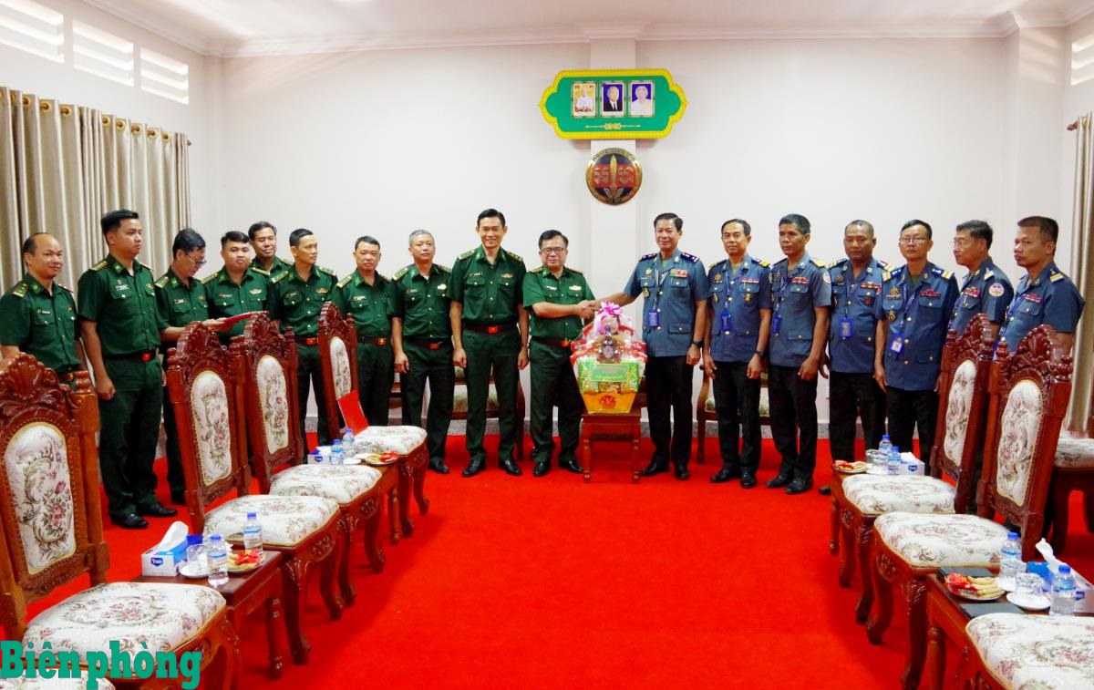 Nhân dịp Tết cổ truyền Chol Chnam Thmay của Vương quốc Campuchia, ngày 6/4, Đoàn công tác Ban Chỉ huy Bộ đội Biên phòng tỉnh Tây Ninh do Đại tá Phạm Văn Cờ, Phó Chỉ huy trưởng, Tham mưu trưởng làm trưởng đoàn đã sang thăm, chúc Tết các lực lượng quản lý, bảo vệ biên giới tỉnh Prey Veng, Campuchia. Tham gia đoàn có đại diện lãnh đạo các phòng, ban nghiệp vụ và Đồn Biên phòng cửa khẩu quốc tế Tân Nam. Đại diện các đơn vị tỉnh Prey Veng cảm ơn Ban Chỉ huy Bộ đội Biên phòng tỉnh Tây Ninh đã dành tình cảm tốt đẹp cho cán bộ, chiến sĩ các đơn vị nhân dịp Tết cổ truyền. Ảnh: Đinh Quân