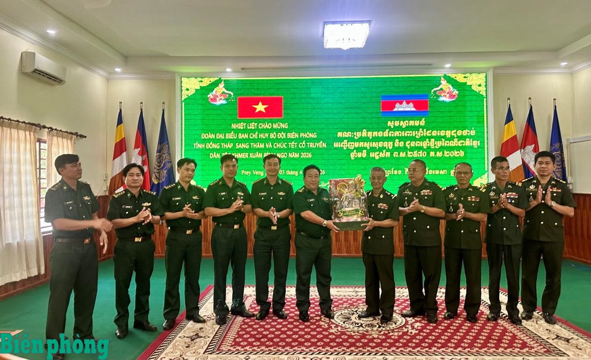 Ngày 3/4, Đoàn công tác Ban Chỉ huy Bộ đội Biên phòng tỉnh Đồng Tháp do Đại tá Nguyễn Văn Tuấn, Phó Chỉ huy trưởng dẫn đầu sang thăm, chúc Tết cổ truyền Chol Chnam Thmay tại Tiểu khu Quân sự, Bộ Chỉ huy Hiến binh và Ty Công an tỉnh Prey Veng, Vương quốc Campuchia; đồng thời trao quà tặng cán bộ, chiến sĩ các đơn vị bạn. Ảnh: Hòa Bình